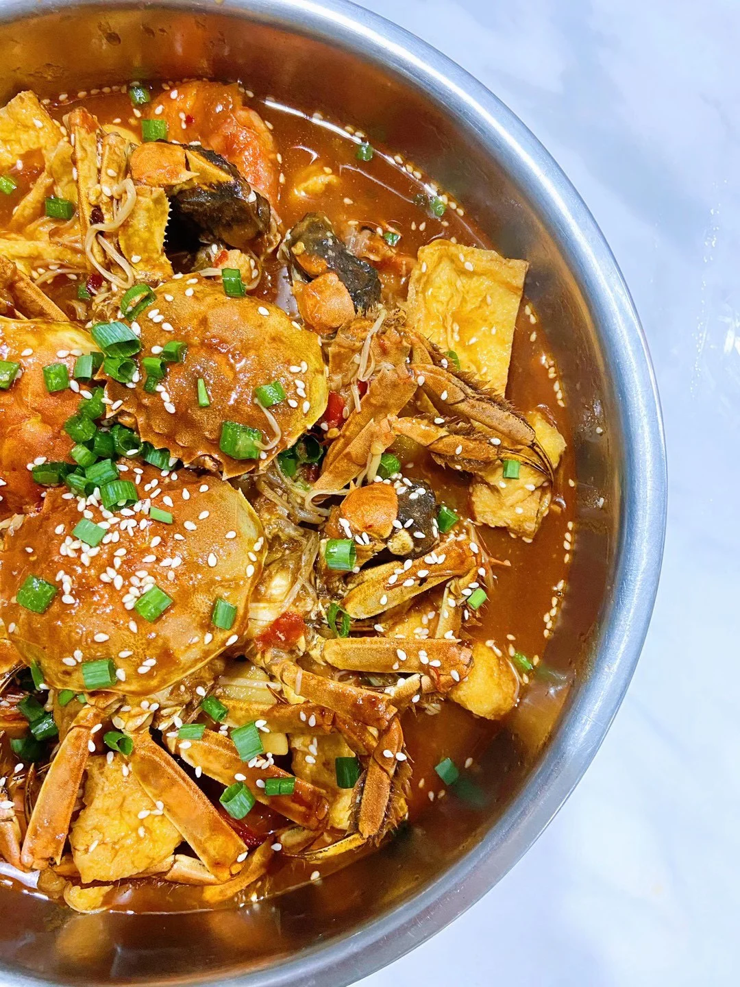 7️⃣煮好后加入螃蟹跟年糕 (喜欢的配菜) 螃蟹的盖子 焖十分钟左右 撒上白芝麻葱花即可✔️(家里有豆腐泡跟金针菇 后来我就烫一下放进去搅拌一下 吸了汤汁后味道超赞)