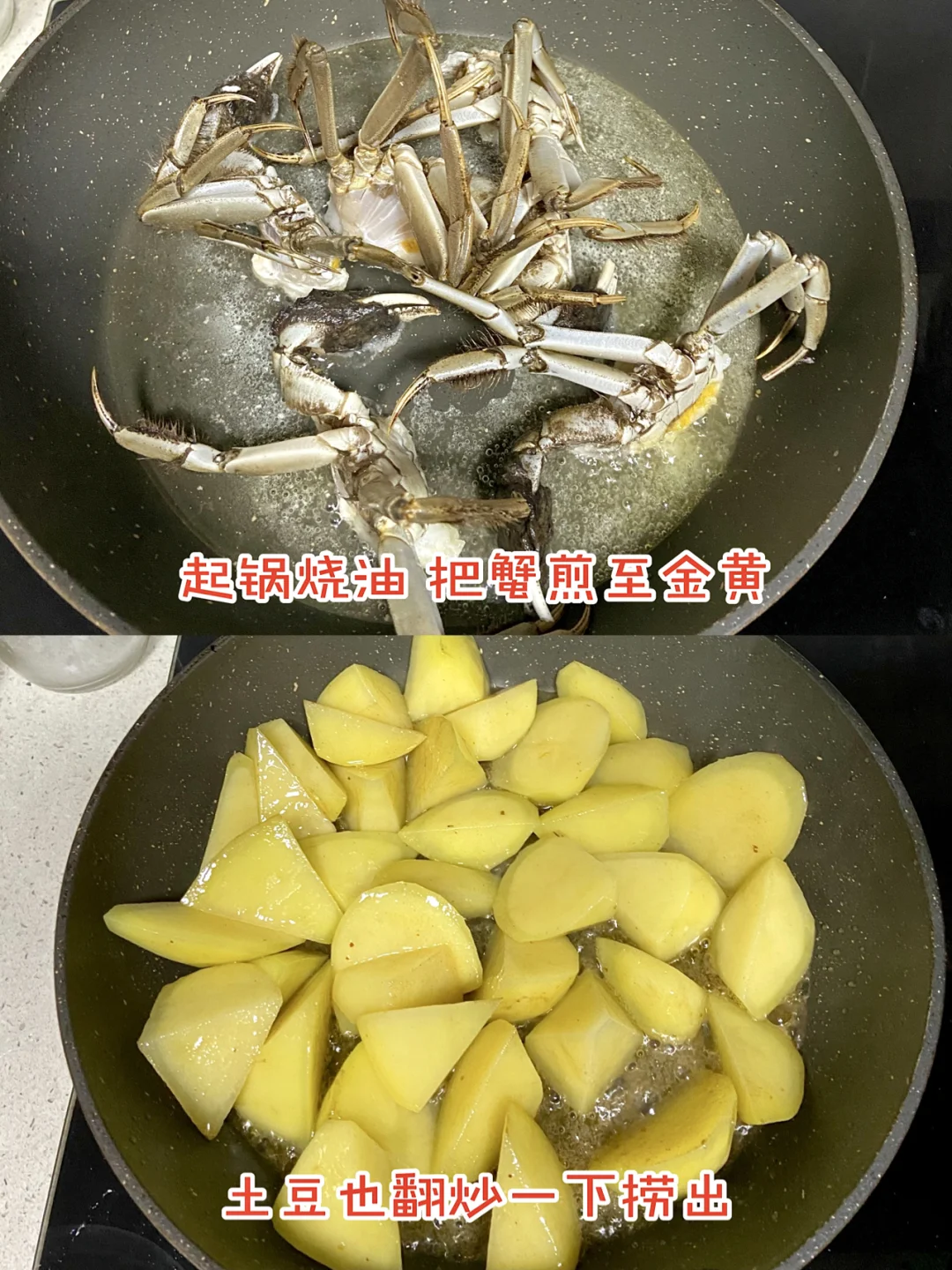 5️⃣ 起锅烧油 把蟹煎至金黄 土豆 分别炸至金黄