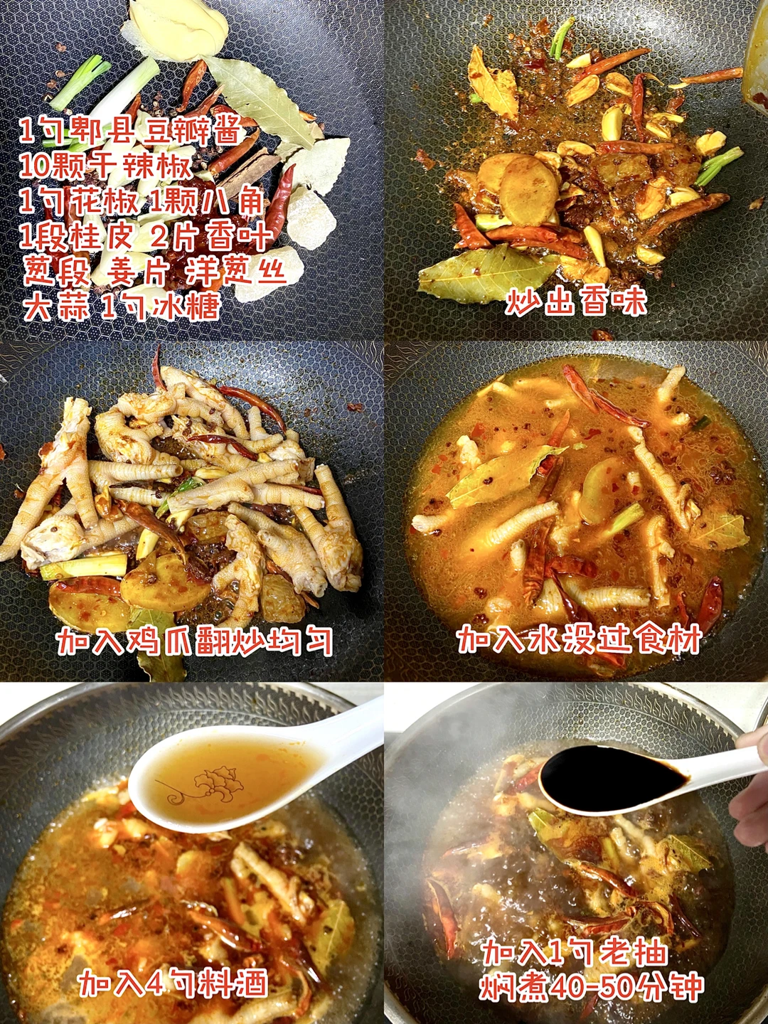 3️⃣另起锅加入一勺郫县豆瓣酱 10颗干辣椒 一勺花椒 一颗八角 一段桂皮 2片香叶 葱段 姜片 洋葱丝 大蒜 1勺冰糖 炒出香味 加入鸡爪翻拌均匀(洋葱忘记拍了)