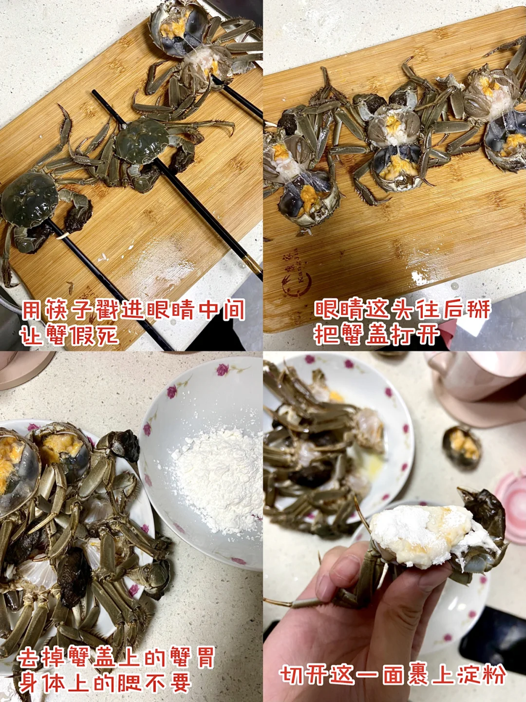 1️⃣蟹去盖 去掉不能吃的部位 对半切 切开的那面均匀裹上淀粉