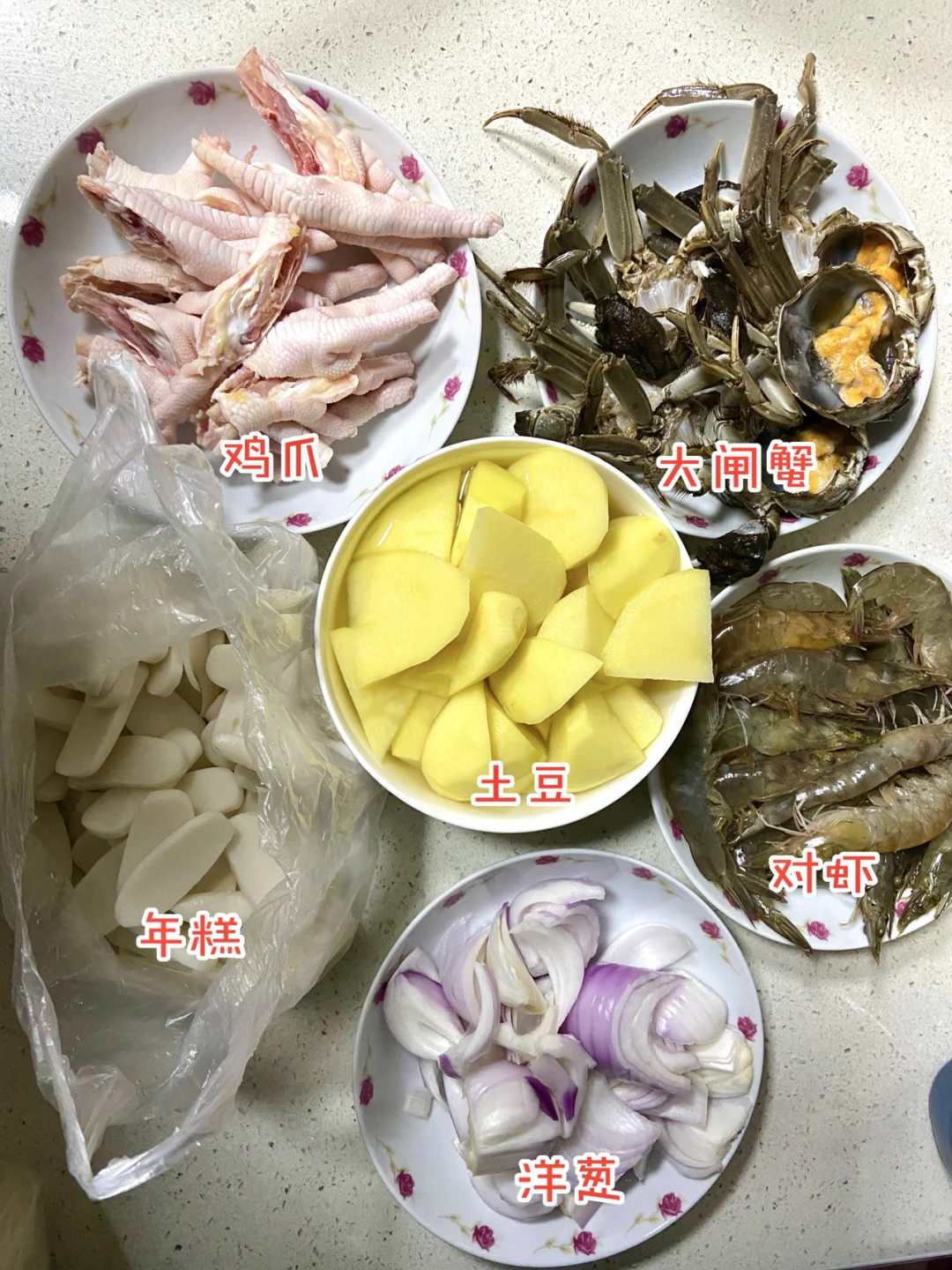 蟹3只 虾半斤 鸡爪半斤 年糕 土豆 洋葱
