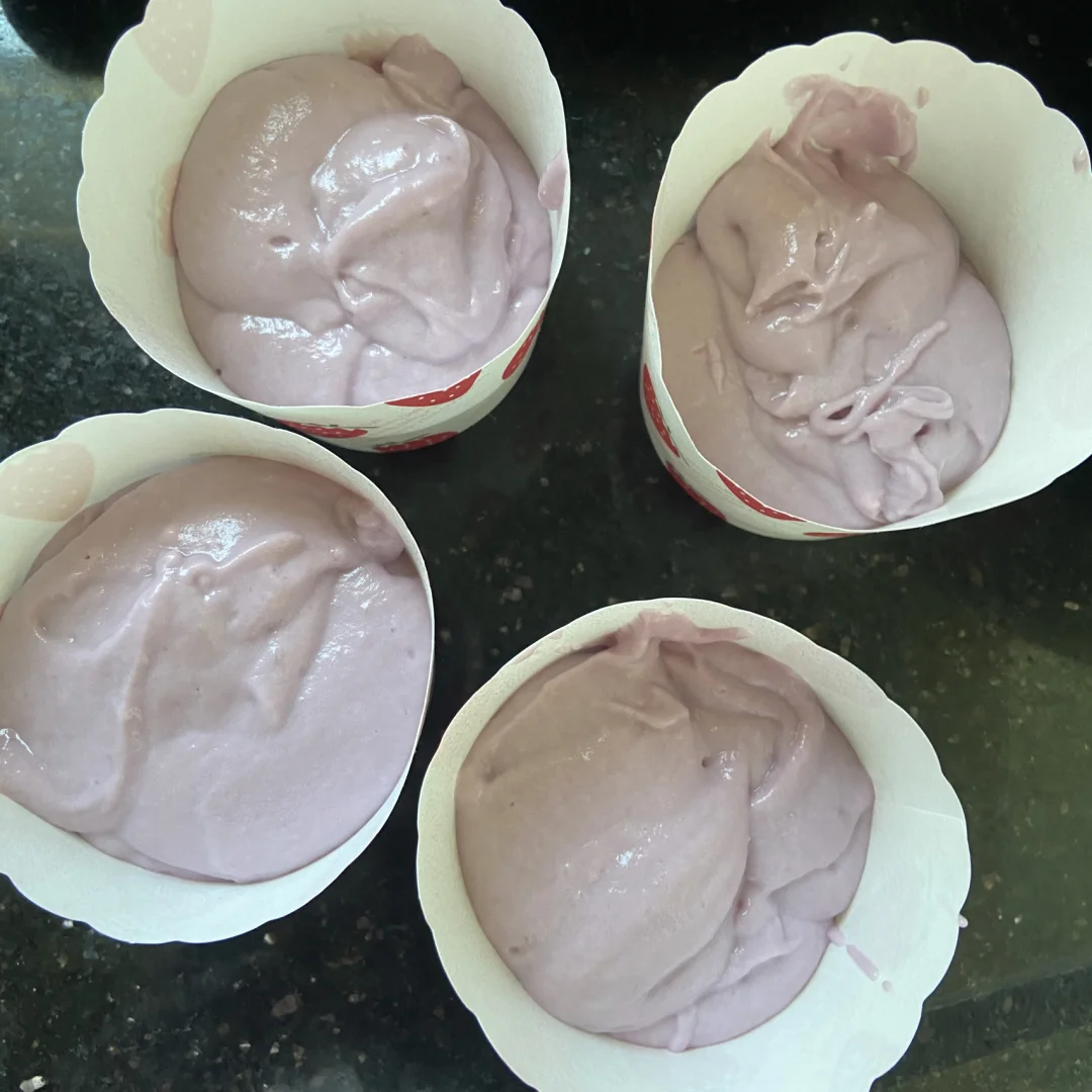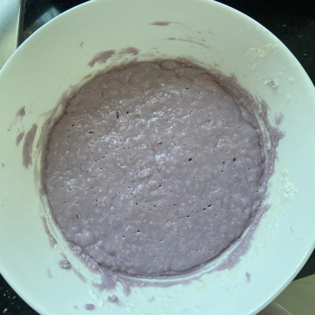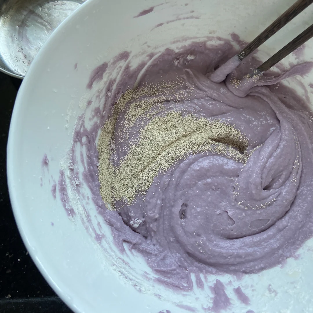 🤲🏻准备食材: 准备材料 紫薯80克 低筋面粉120g 配方奶150ml 酵母2g 👩🏻🍳制作方法: 1️⃣紫薯蒸熟加配方奶打成糊 2️⃣糊中加入酵母 筛入低筋面粉 搅拌均匀 3️⃣盖上保鲜膜 静置发酵30分钟至两倍大 发酵好的糊上面会有很多明显的气孔 4️⃣用筷子顺时针搅拌糊排气 5️⃣模具刷油 倒入模具中倒5分满就行 6️⃣冷水上锅大火煮沸转小火蒸20分钟 闷3分钟即可✔️