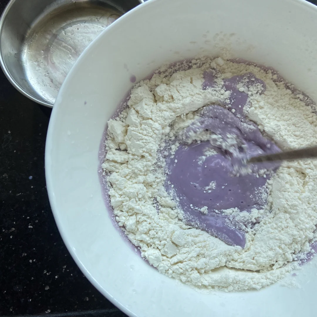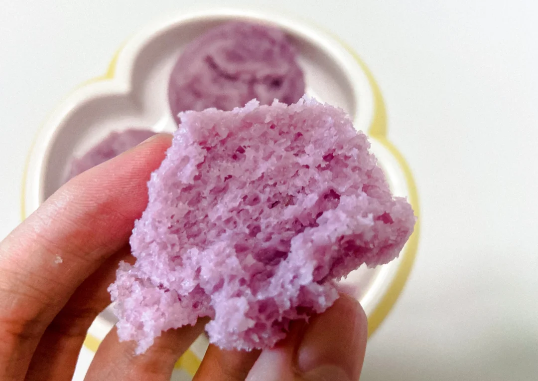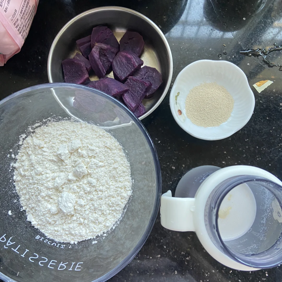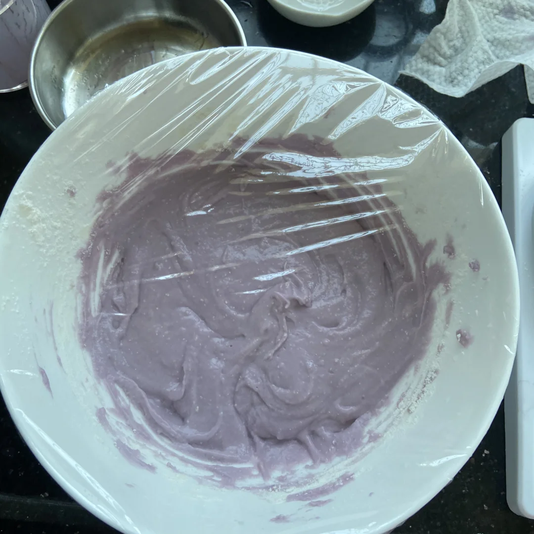 🤲🏻准备食材: 准备材料 紫薯80克 低筋面粉120g 配方奶150ml 酵母2g 👩🏻🍳制作方法: 1️⃣紫薯蒸熟加配方奶打成糊 2️⃣糊中加入酵母 筛入低筋面粉 搅拌均匀 3️⃣盖上保鲜膜 静置发酵30分钟至两倍大 发酵好的糊上面会有很多明显的气孔 4️⃣用筷子顺时针搅拌糊排气 5️⃣模具刷油 倒入模具中倒5分满就行 6️⃣冷水上锅大火煮沸转小火蒸20分钟 闷3分钟即可✔️