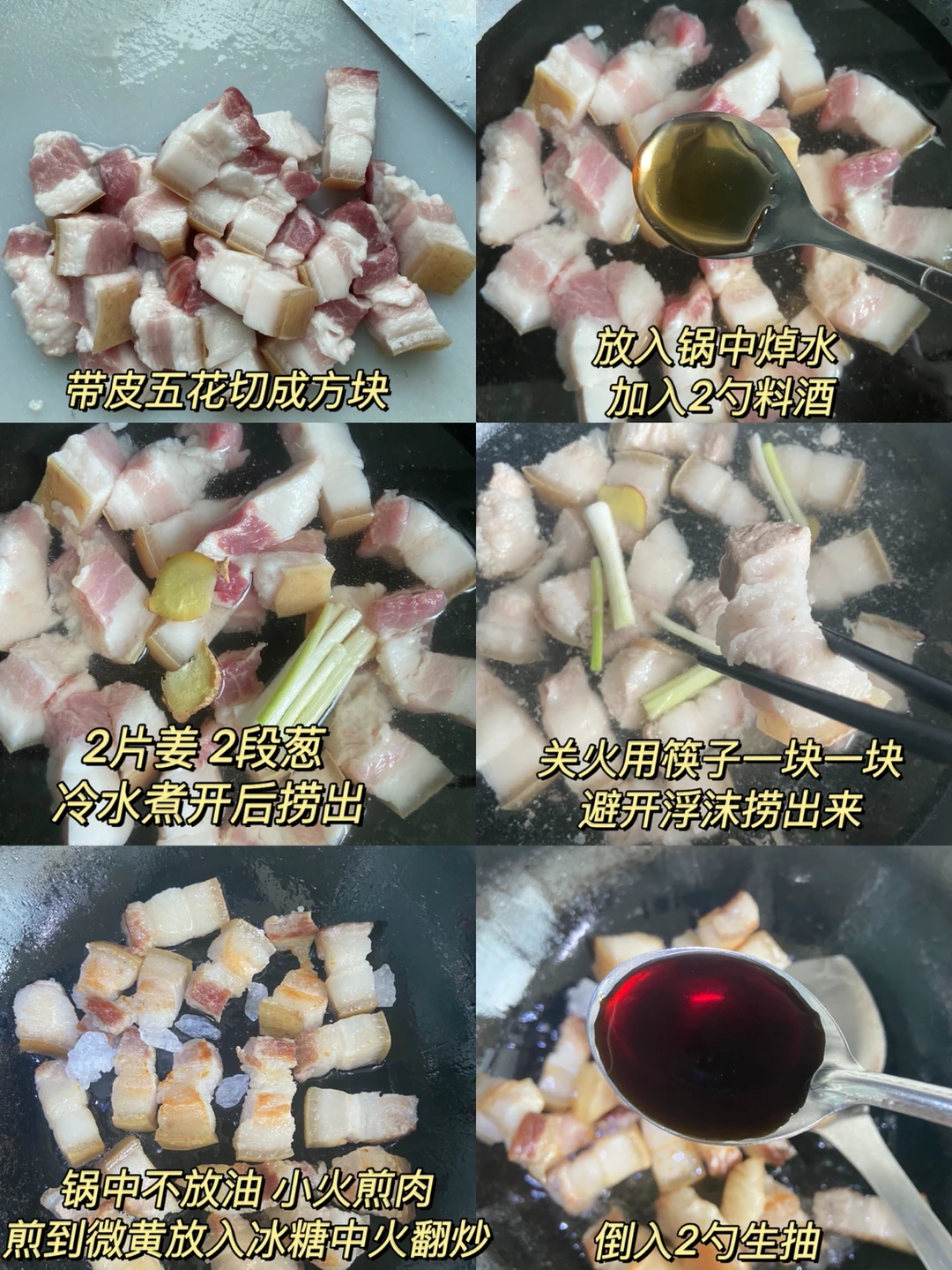1️⃣带皮五花切成方块 放入锅中焯水 加入2勺料酒 2片姜 2段葱 冷水煮开后捞出(关火用筷子一块一块避开浮沫捞出来,不要过冷水)