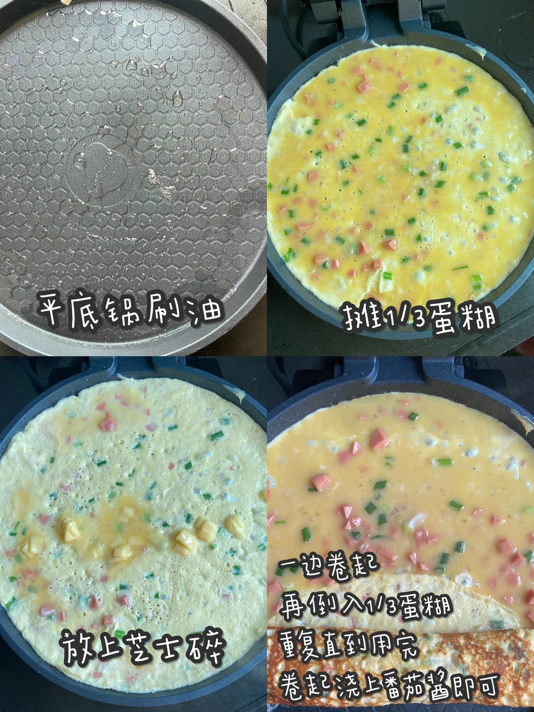 3️⃣平底锅中涂抹少许食用油 开小火倒入1/3的蛋液摊开 定型后撒适量芝士