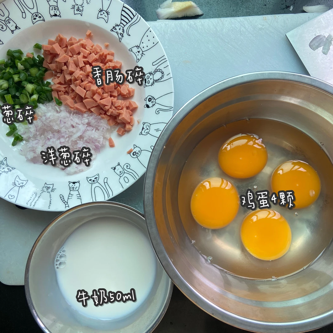 鸡蛋4个 芝士片2片或芝士碎 葱1根 洋葱半个 纯牛奶50ml(温水也可以)火腿香肠一根 盐少许 食用油少许