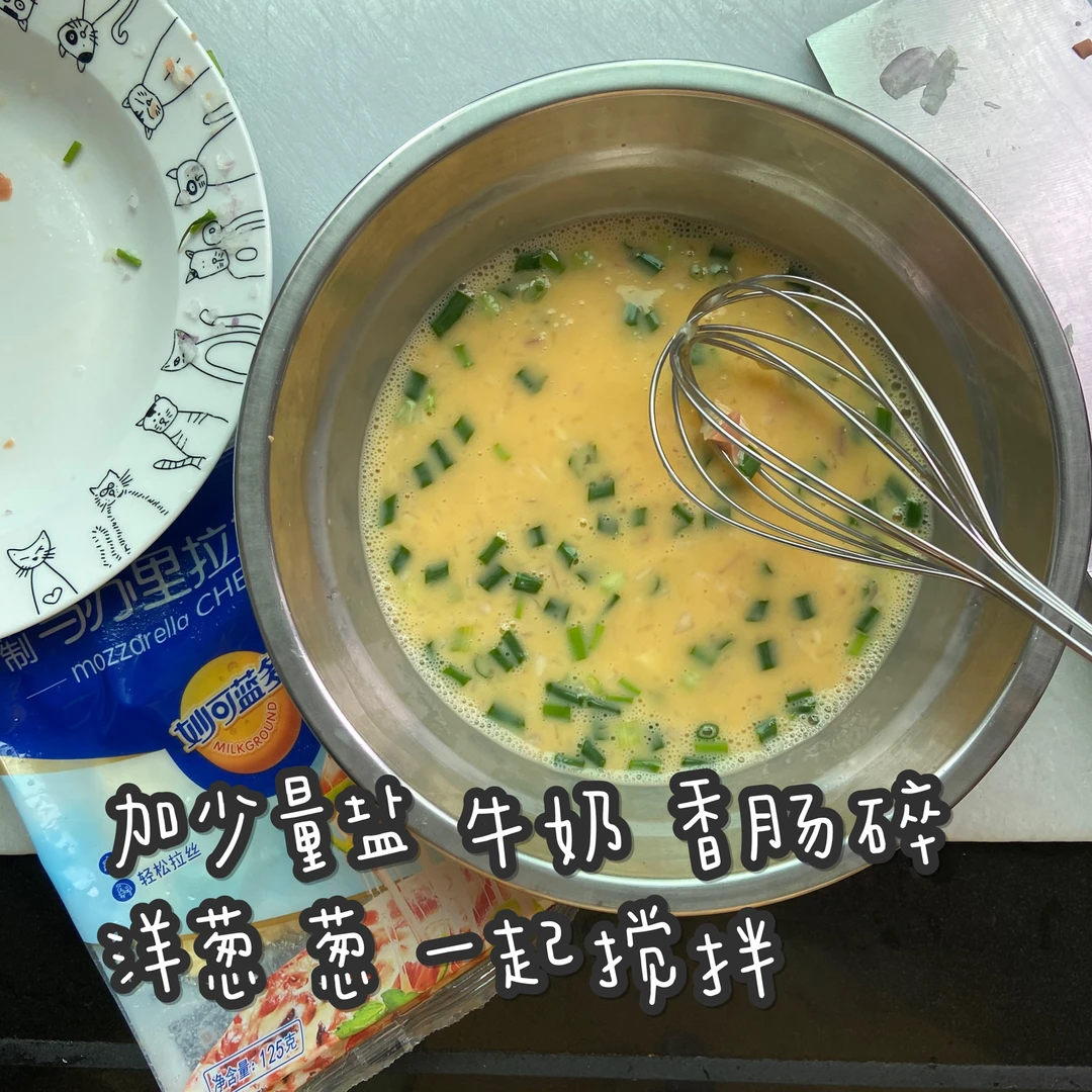2️⃣鸡蛋打入碗中 加入温水(牛奶)搅打均匀 将火腿 葱 洋葱和盐放进去搅拌均匀