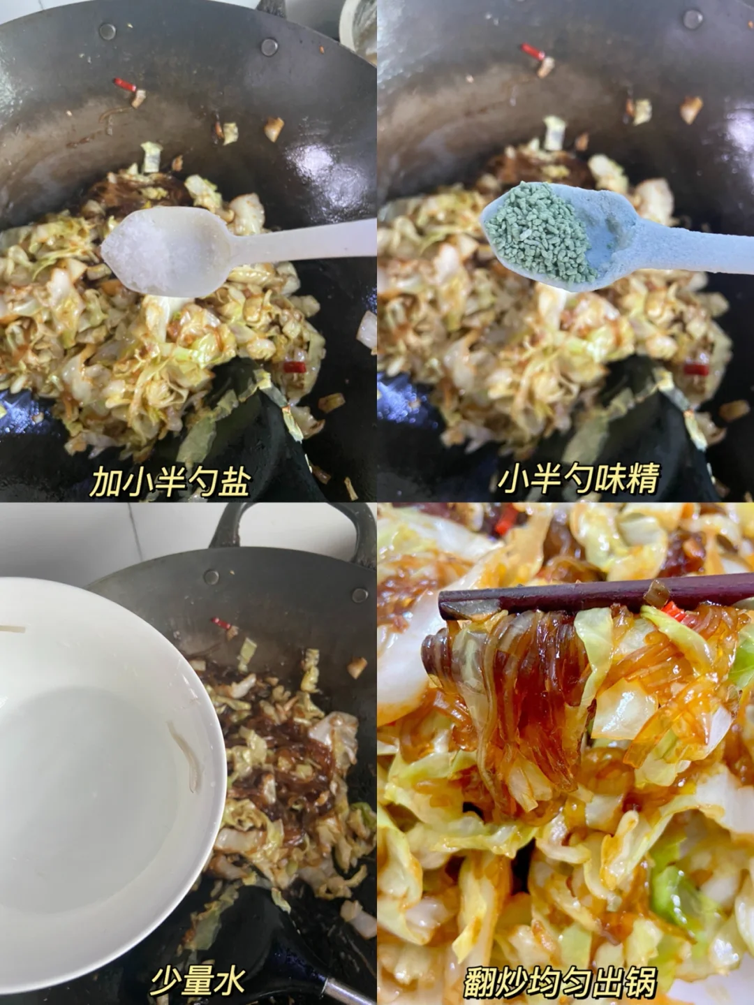 3️⃣倒入粉丝➕一勺生抽➕一勺老抽➕一勺蚝油少许盐鸡精 可以适当加入一点水翻拌均匀即可✔️