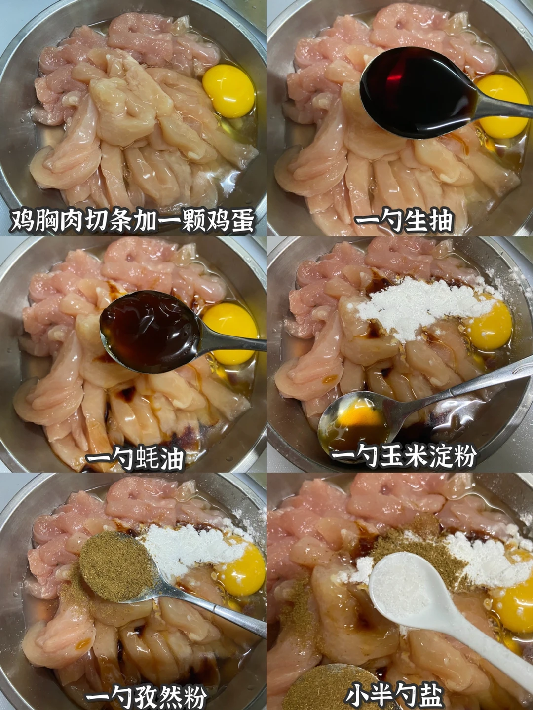 1️⃣鸡胸肉切条➕一颗鸡蛋➕一勺生抽➕一勺蚝油➕一勺玉米淀粉➕一勺孜然粉➕小半勺盐 抓均匀冷藏腌制1小时以上