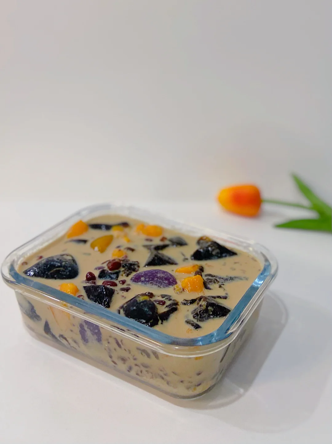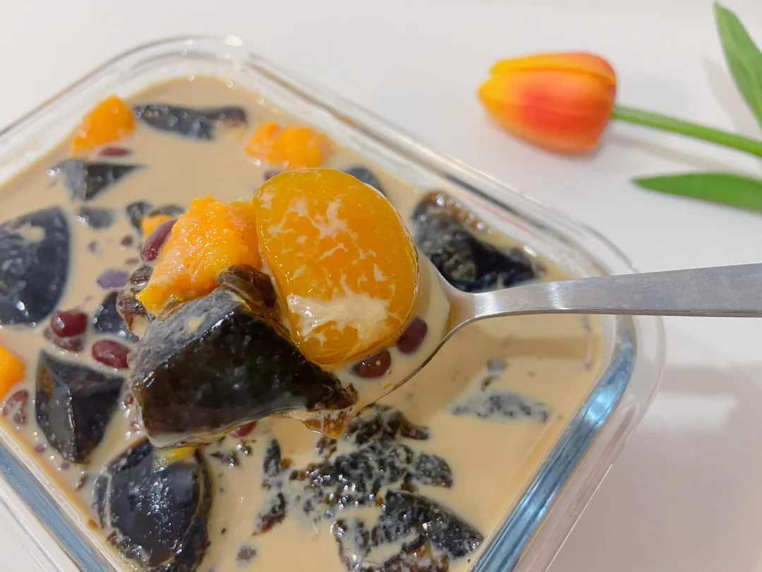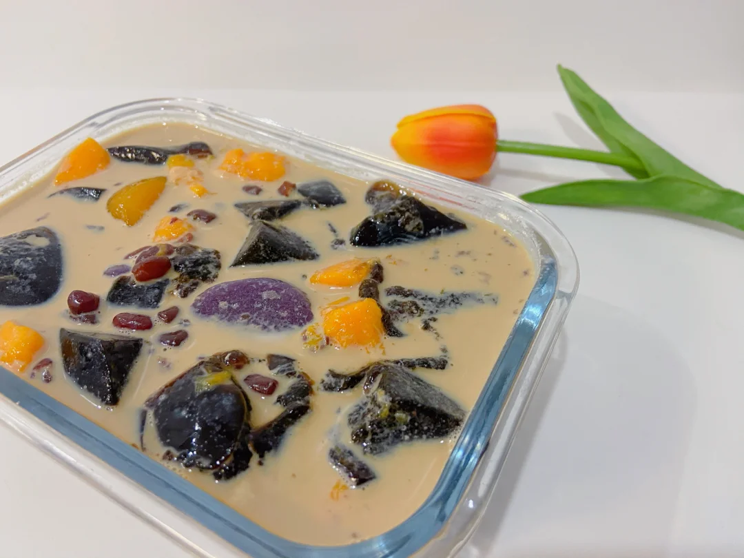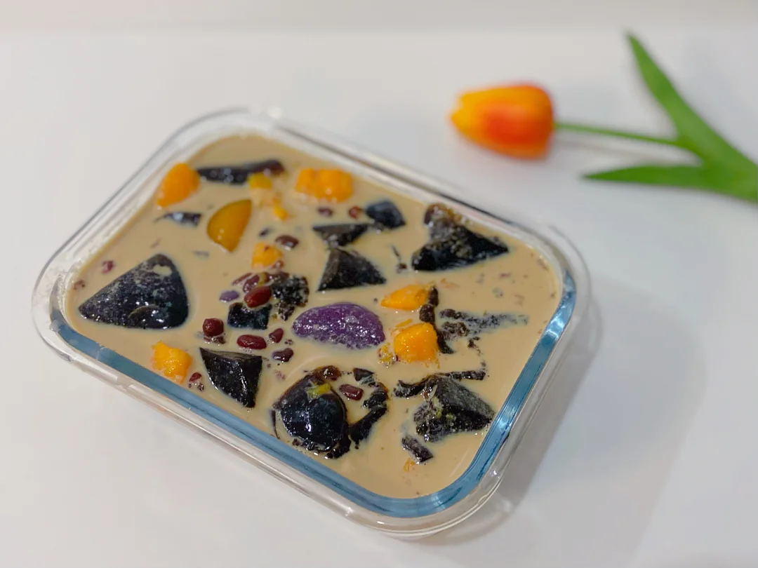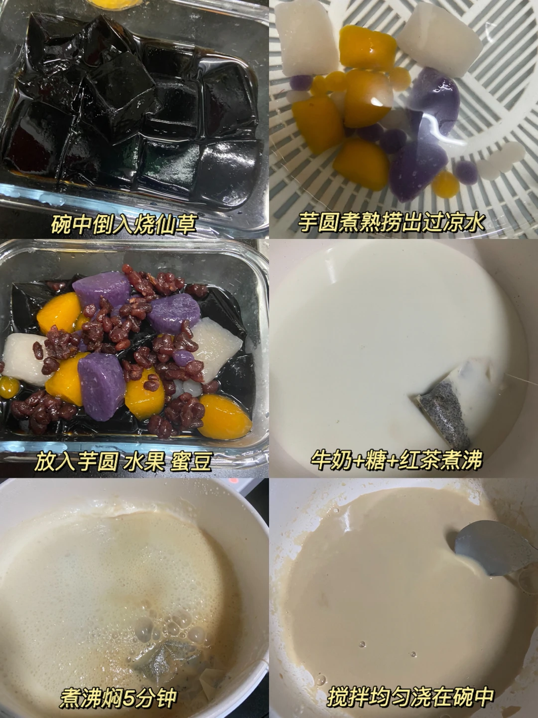 4️⃣碗中放入烧仙草 芋圆 喜欢吃的水果 蜜豆 倒入奶茶/牛奶即可