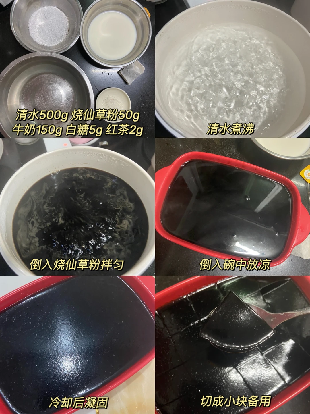 1️⃣清水煮沸 倒入烧仙草粉拌匀 倒入碗中凝固切块备用