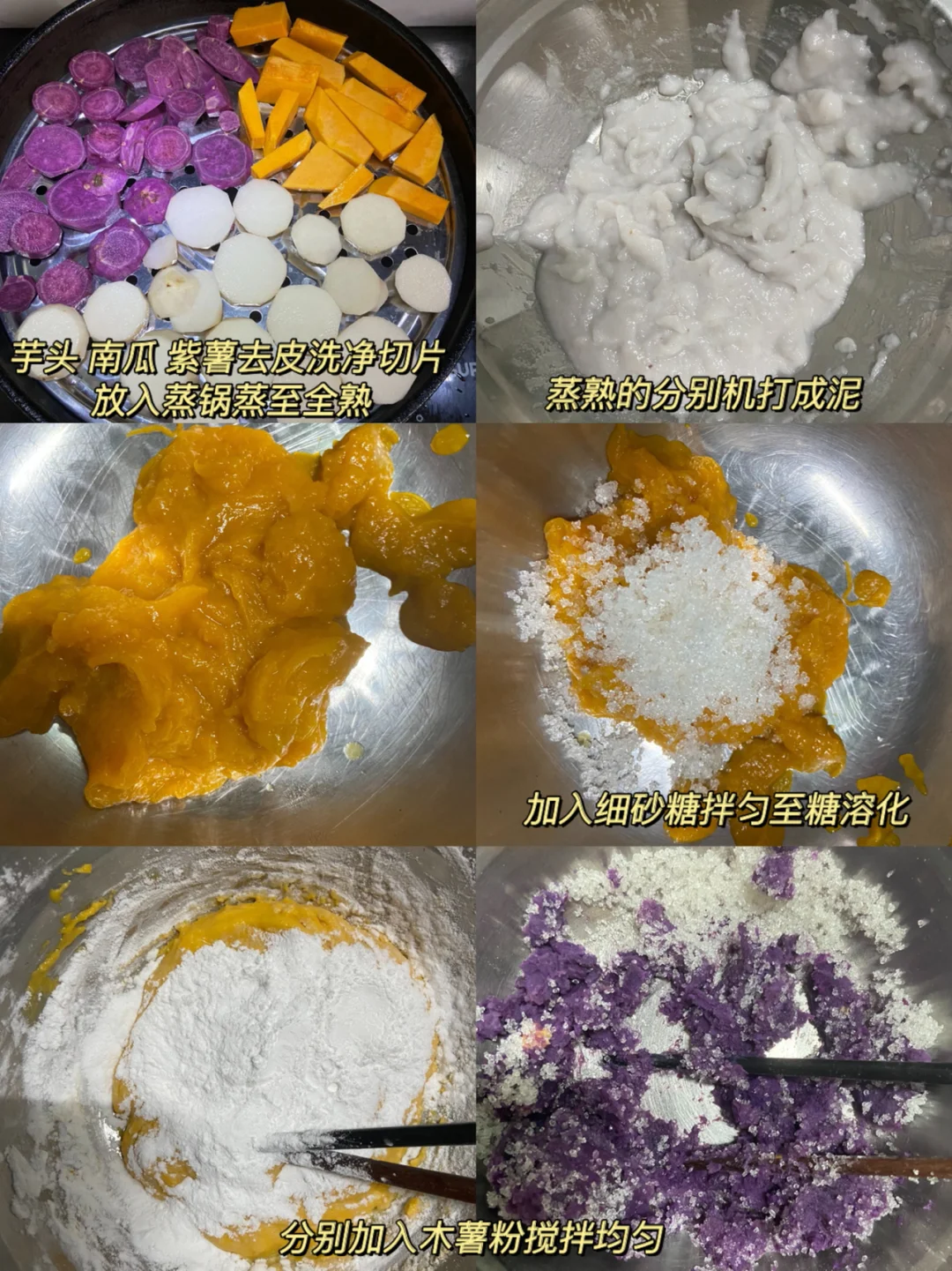 1️⃣芋头 南瓜 紫薯去皮洗净切片 放入蒸锅蒸至全熟