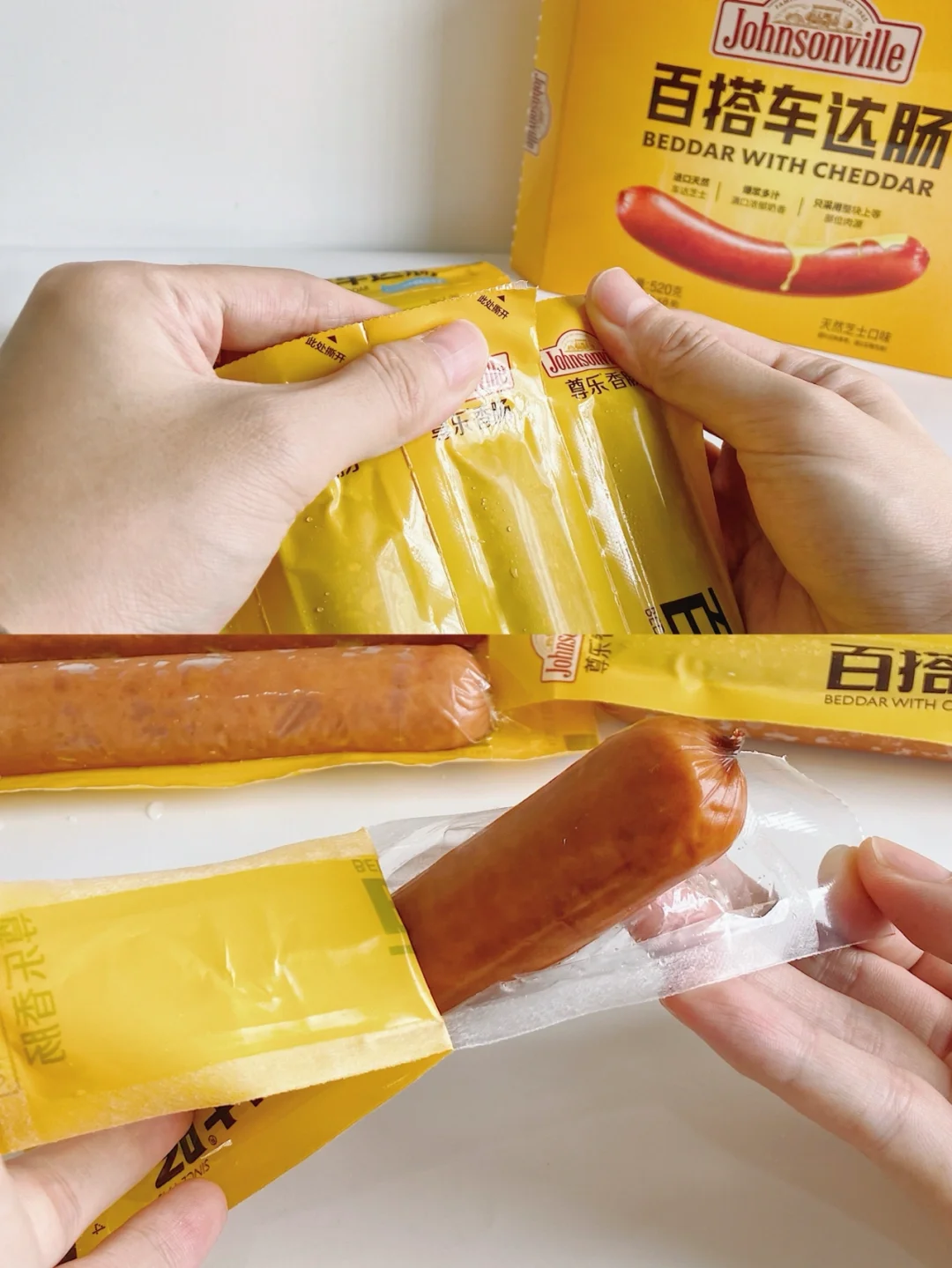😇拆开包装就袭来一股烟熏味,特别香,肠衣非常薄,口感鲜嫩,加热后的芝士会爆浆,非常浓郁!而且还可以多种做法!可煎可烤可煮✔