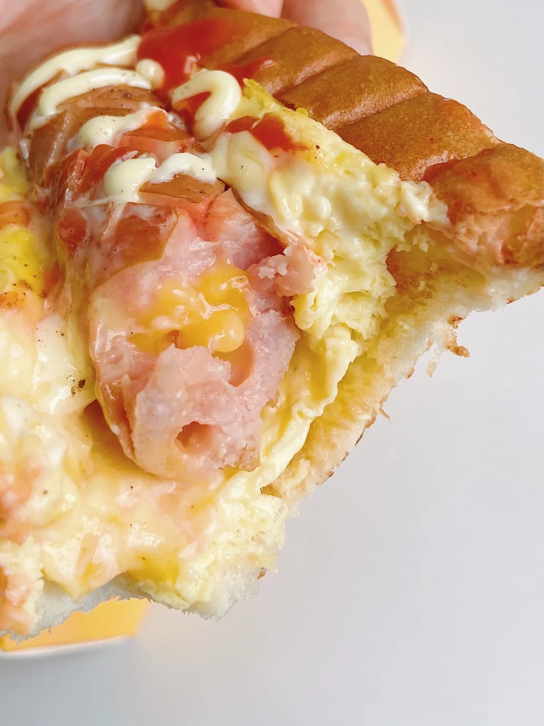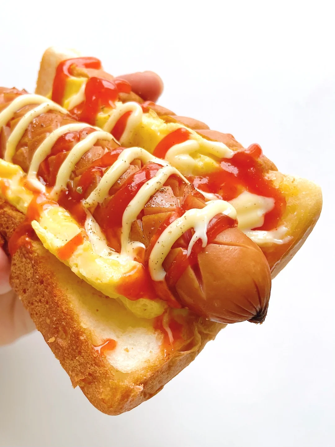 4️⃣香肠煎熟,吐司片打底➕滑蛋➕香肠➕挤上番茄酱沙拉酱即可。
