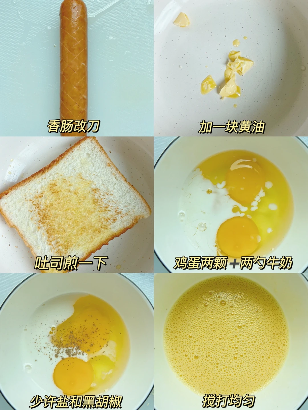 1️⃣香肠改刀 吐司煎一下