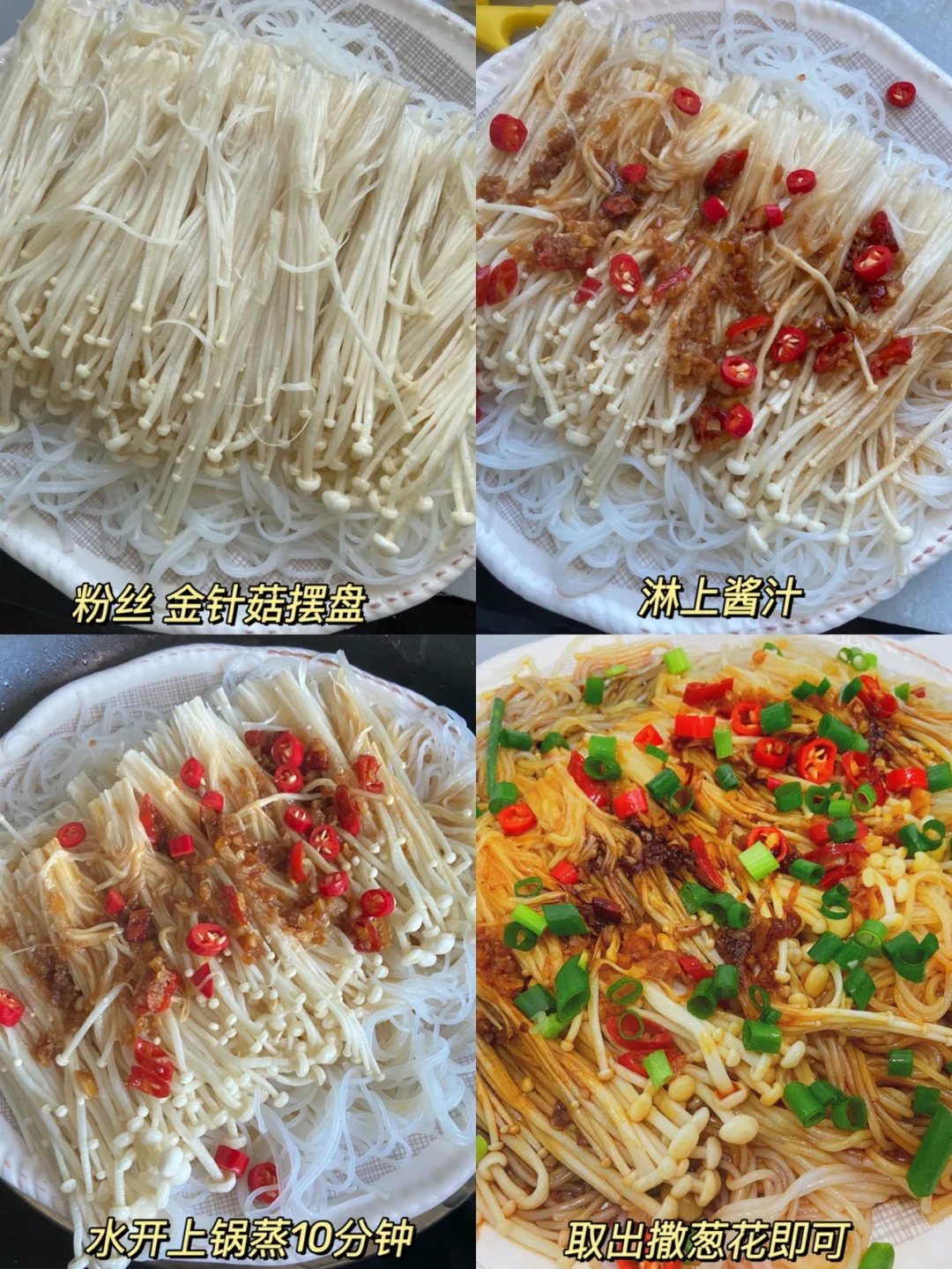 1️⃣粉丝提前烫软装盘 金针菇洗净去根摆盘