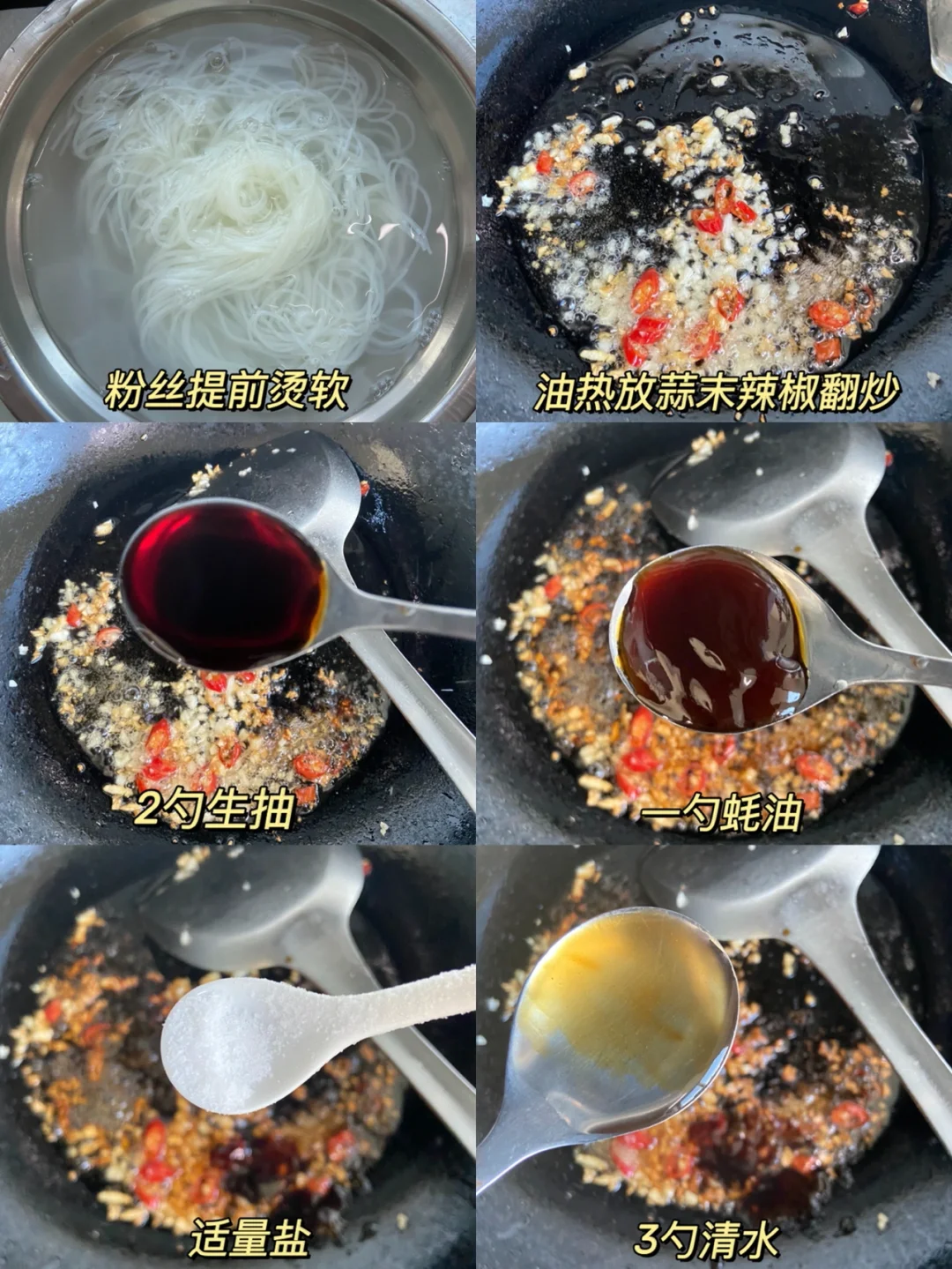 2️⃣油热放蒜末辣椒翻炒➕2勺生抽➕勺蚝油➕少许盐➕3清水翻匀煮沸关火