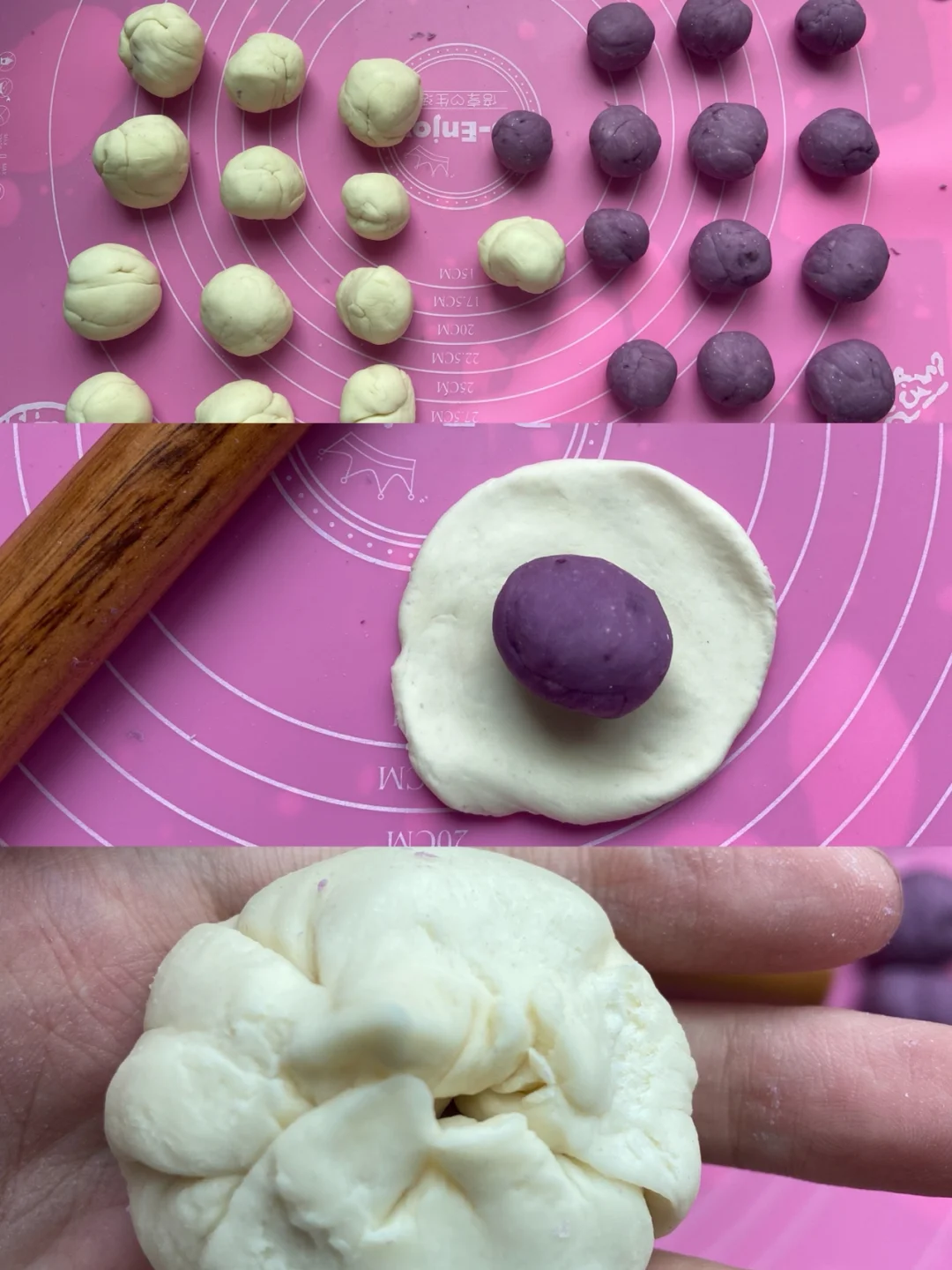 3️⃣白面团擀成圆形 把紫薯面团包进去 用虎口收紧收口处朝下摆放(做紫薯卷的化两个面团擀平 叠在一起 卷起来 切开就行)