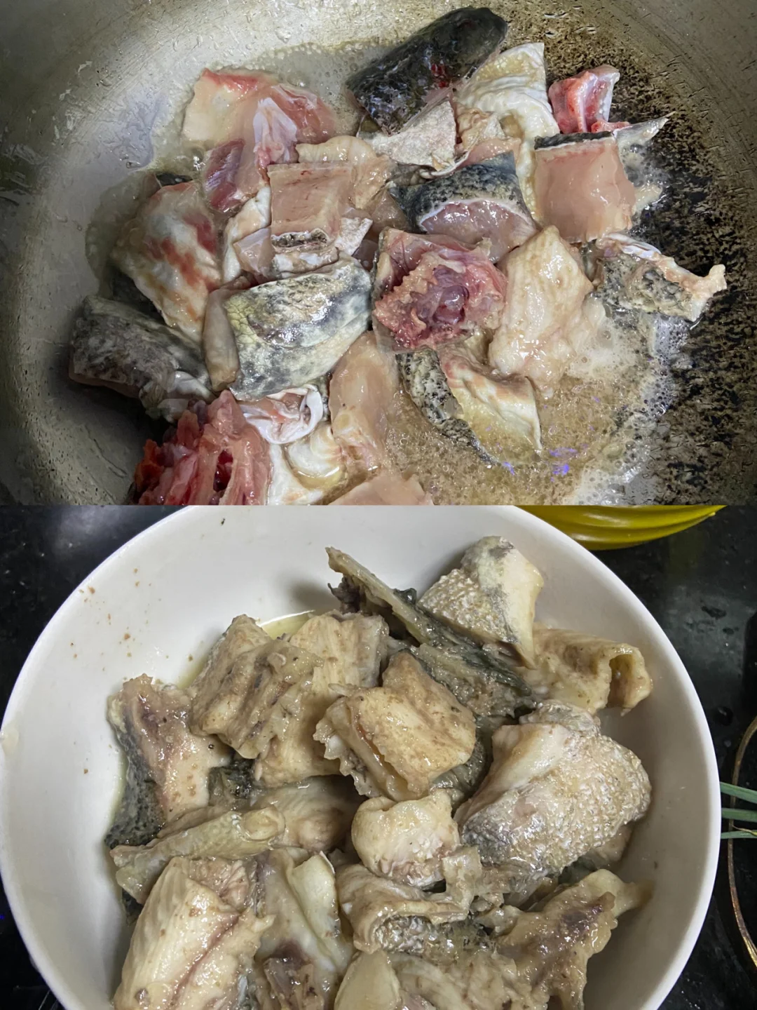 2️⃣鱼切片 鱼骨下油锅炒至金黄捞起