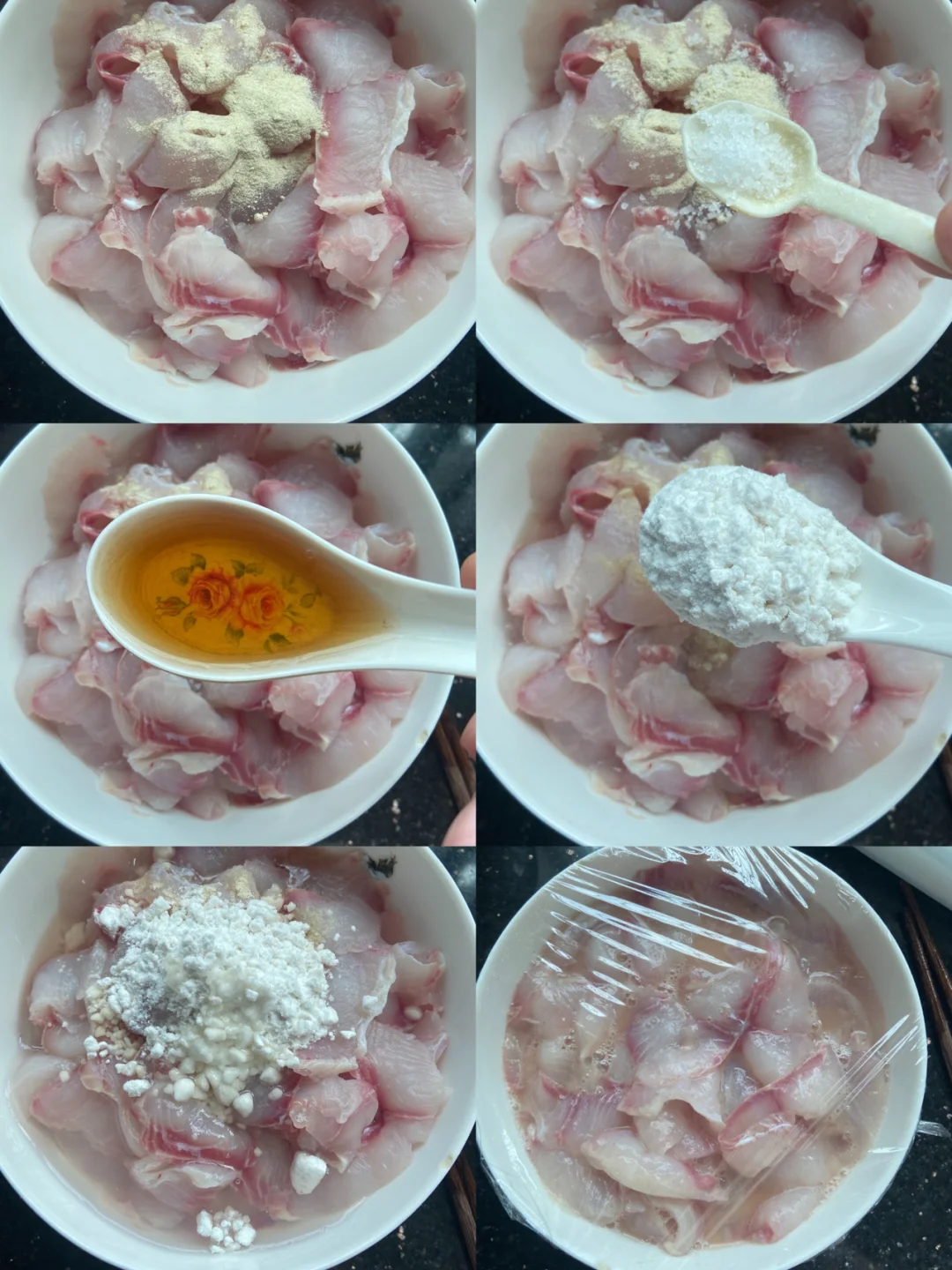 1️⃣鱼肉加料酒 蛋清 胡椒粉 盐 淀粉 腌10分钟 鱼骨加料酒 胡椒粉 盐 腌制10分钟