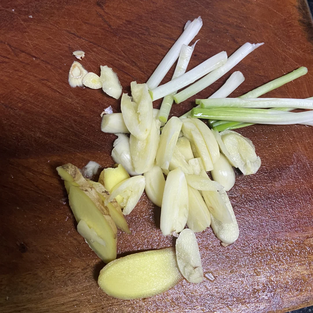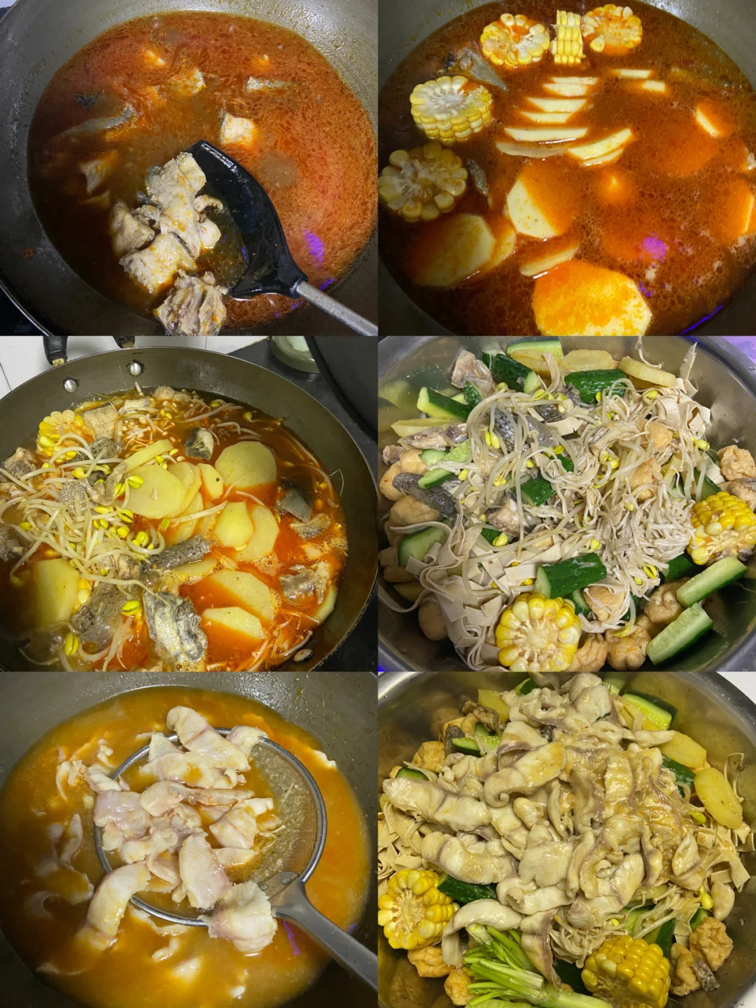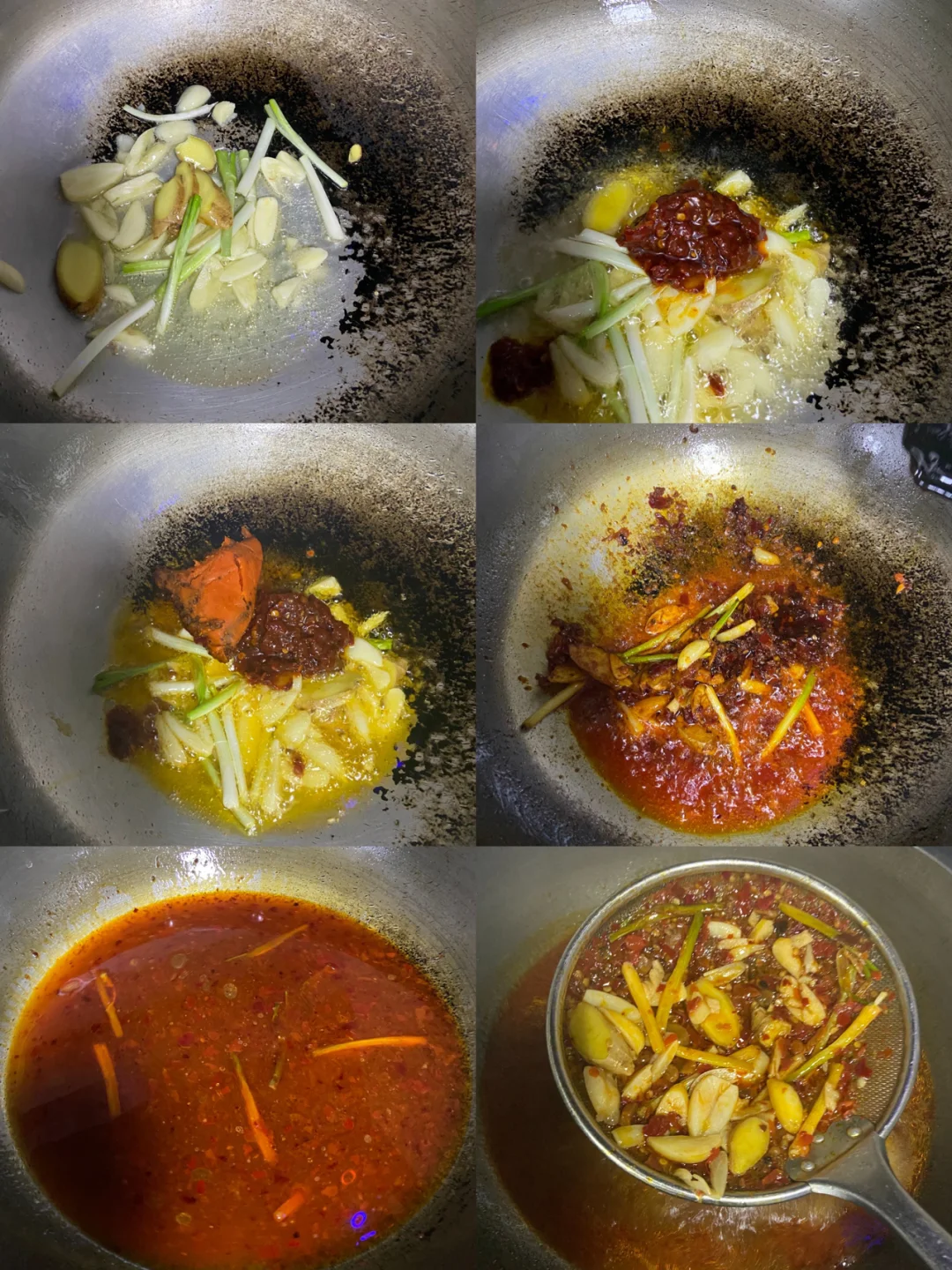 3️⃣葱蒜姜下油锅炒香 放1勺豆瓣酱 一块火锅底料 炒出红油 倒入开水 (可以尝一口味道自己再调咸淡)