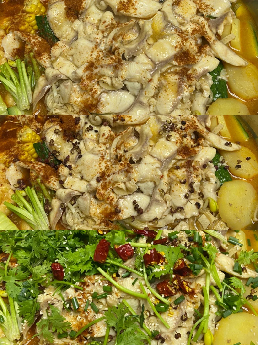 7️⃣放上干辣椒段 辣椒面 白芝麻 浇上热油 放上葱花或者香菜点缀即可