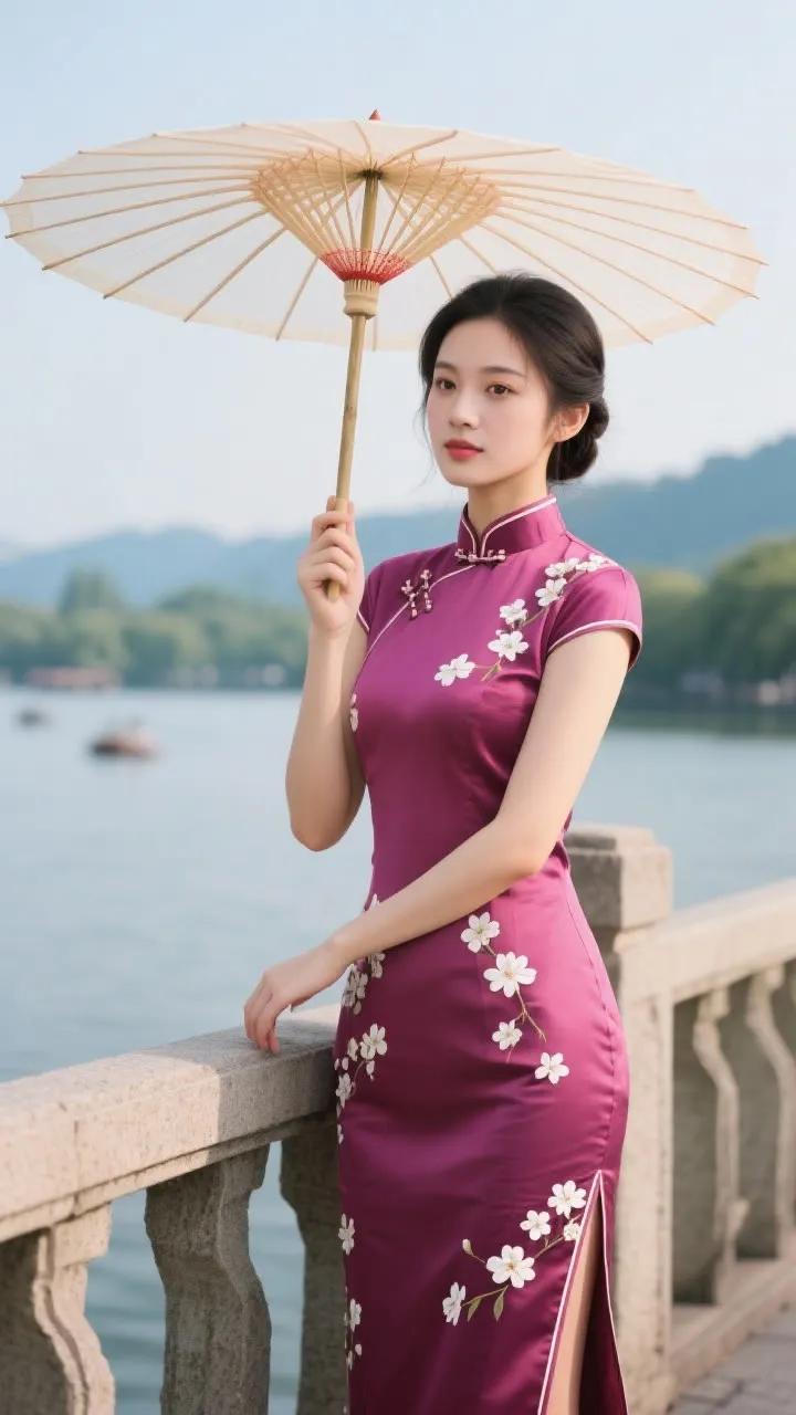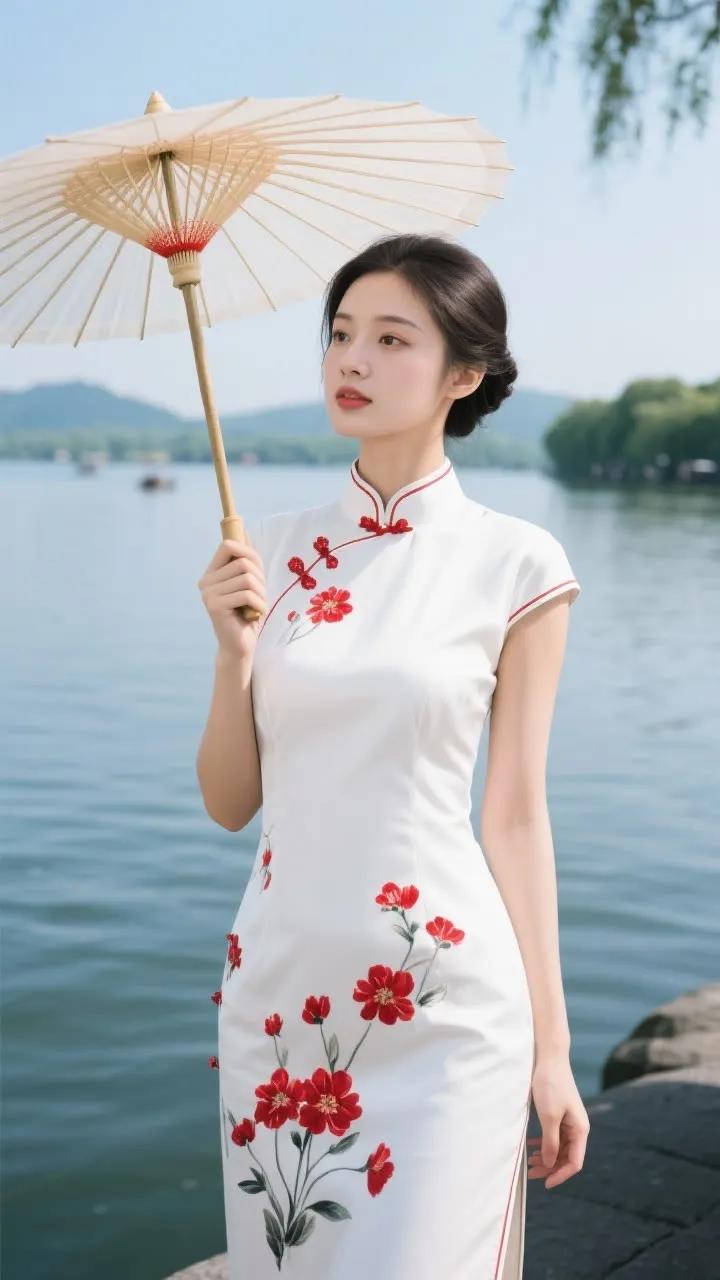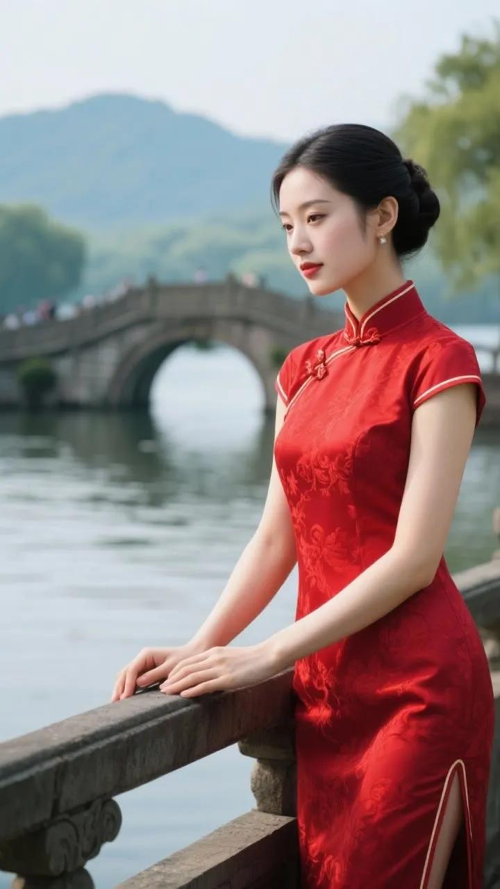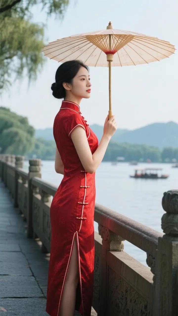 古典旗袍与红伞相映成趣,湖畔漫步,感受东方韵味。