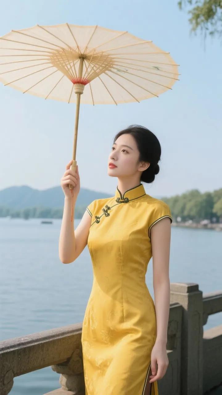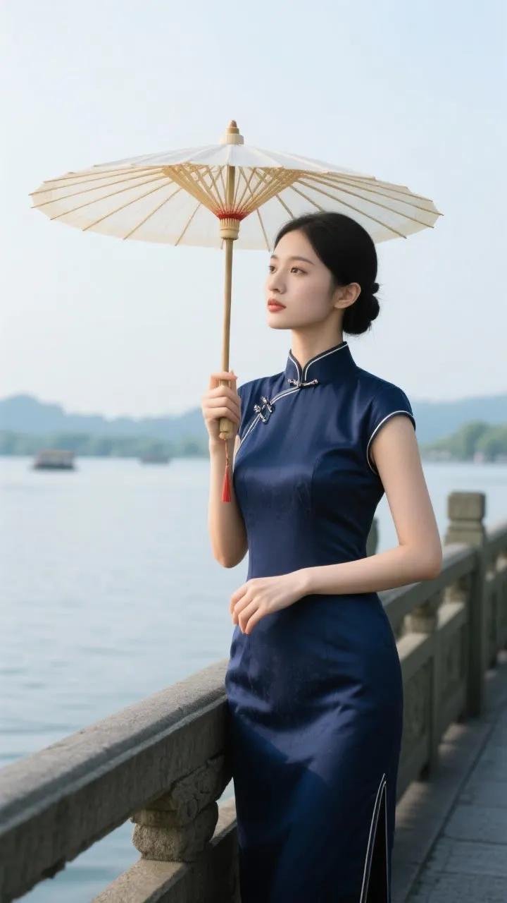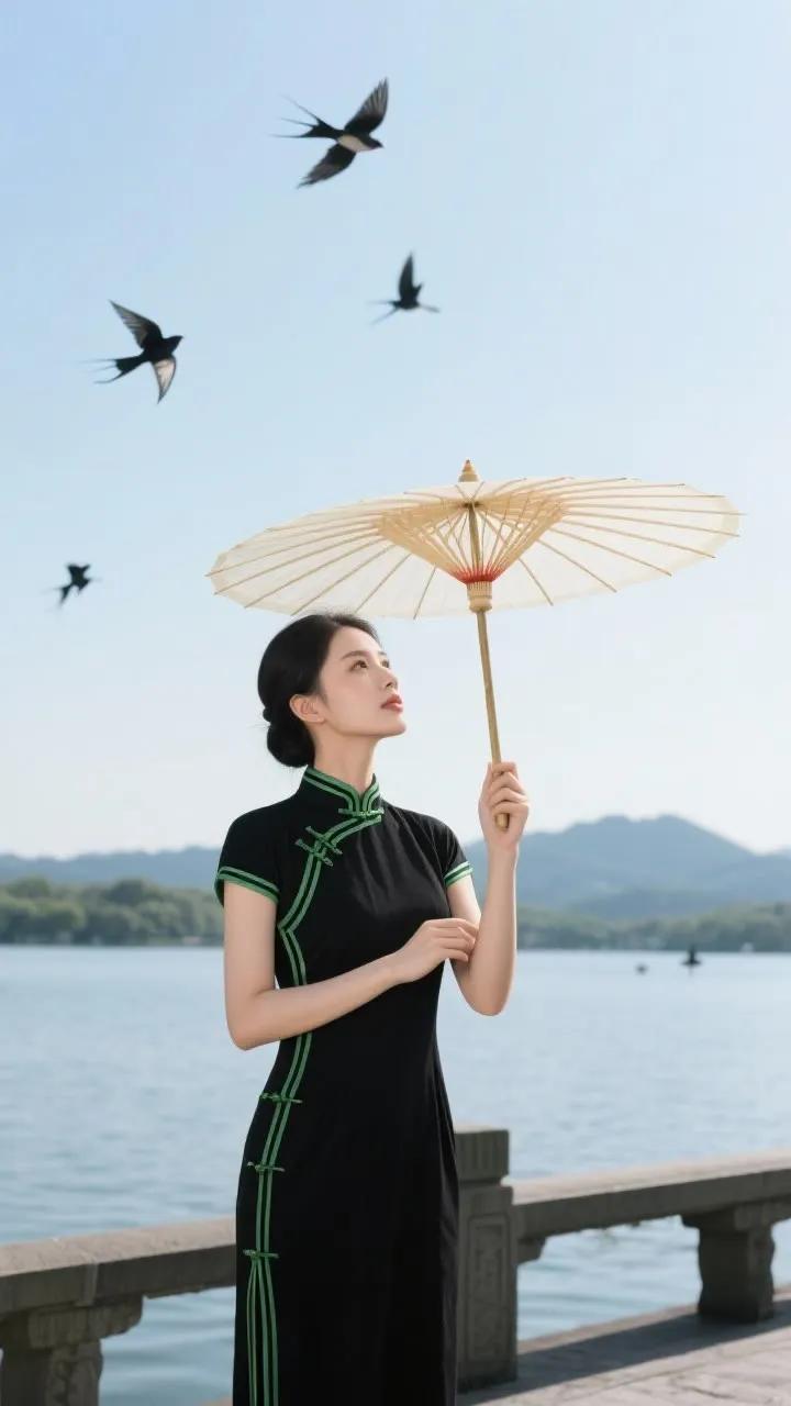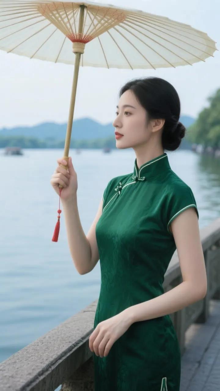古典旗袍与红伞相映成趣,湖畔漫步,感受东方韵味。