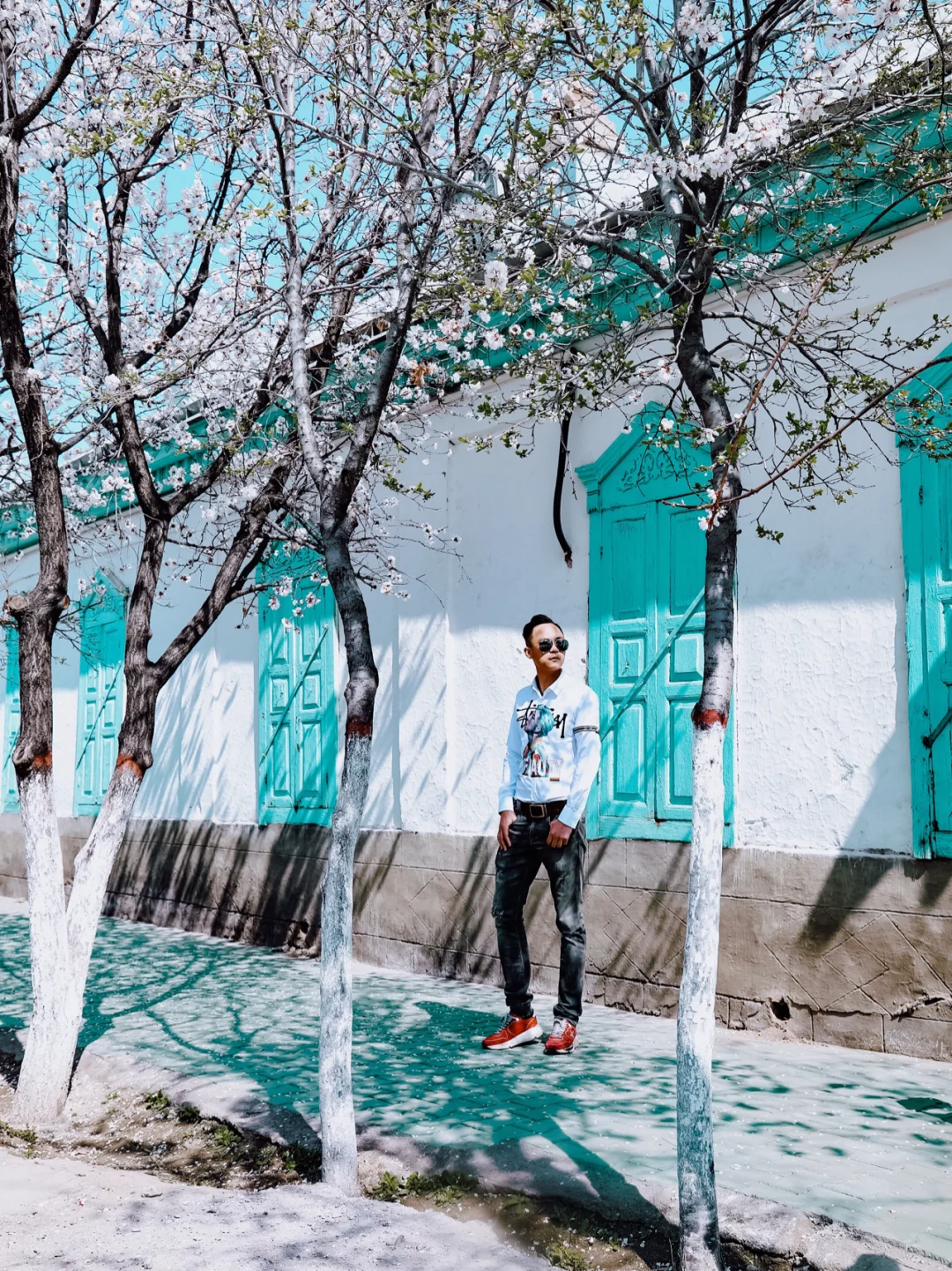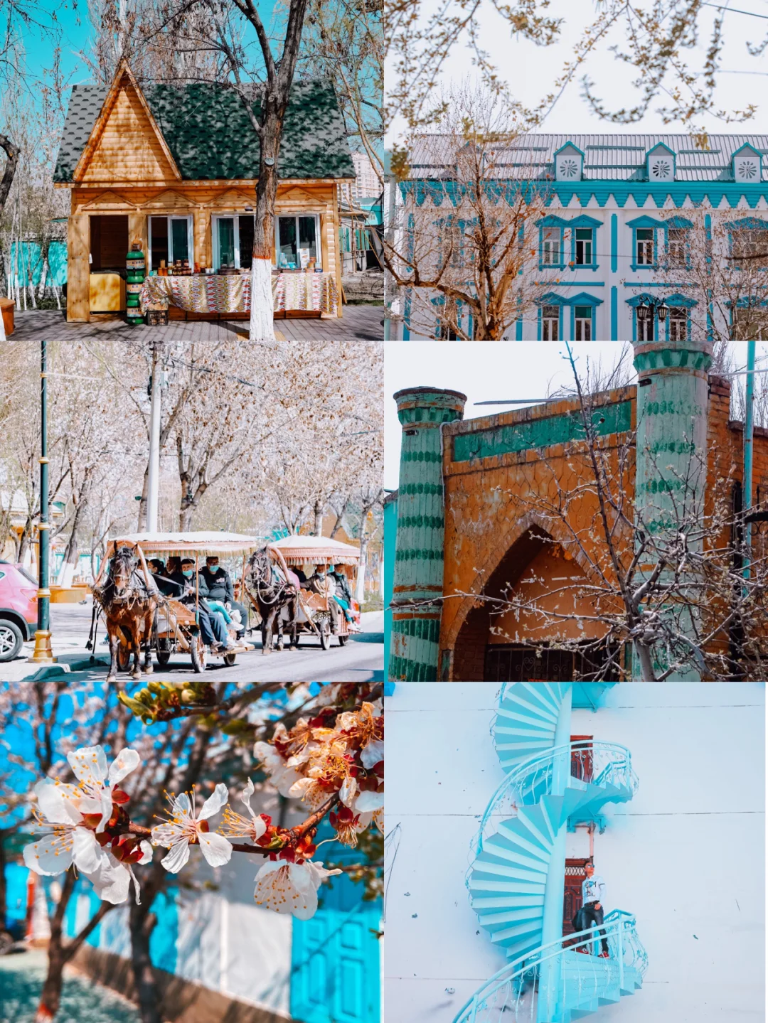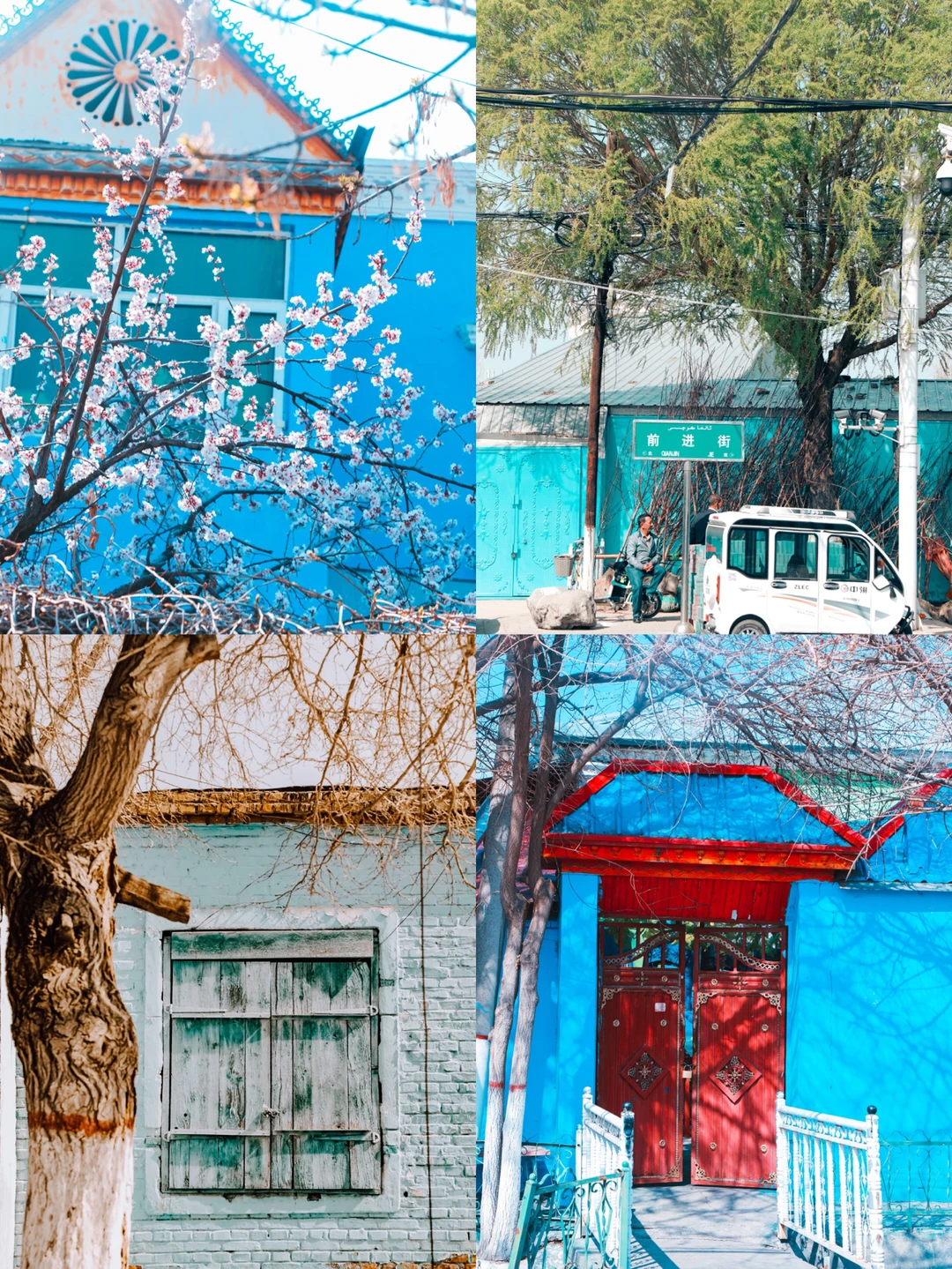 伊宁有座东方版的“摩洛哥” 简直太酷,太好拍照了。 它就是伊宁市的【喀赞其民俗村】 这里是维吾尔族民俗风情街, 这里的房子以蓝色为主 每家每户都有自己钟爱的蓝色色调 特别是杏花盛开时节。 杏花与蓝色交响辉映 编制着梦幻般的童话世界。 【游玩体验】 1⃣️从景区门口牌坊走进来的右手边,大概走300米,有很多出漂亮的蓝色窗户。太好拍照了。 2⃣️旋转店楼梯,是在从景区进来左边,第二栋蓝色建筑的边上(一个巷子口)太酷的蓝色楼梯! 3⃣️这里有些房子在拆了,可以随机找一些巷子去发现不同的美景。 4⃣️这里还可以坐马车的游玩,这样可以区不同的景点,问了一下是100元一人,有点贵没有坐。 5⃣️这里也有一家不错的雪糕店,三个雪糕球17元。一盒一盒买的10元一盒。味道还是不错的。 又是一年杏花时节好光景 落花时节又逢君。 伊宁的杏花已经盛开 明媚的春光等你来邂逅。