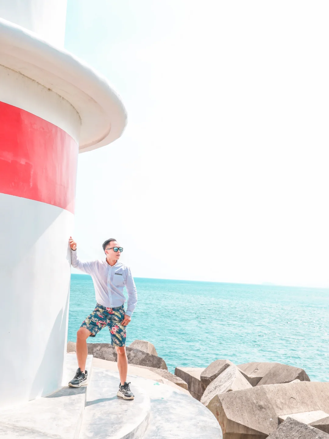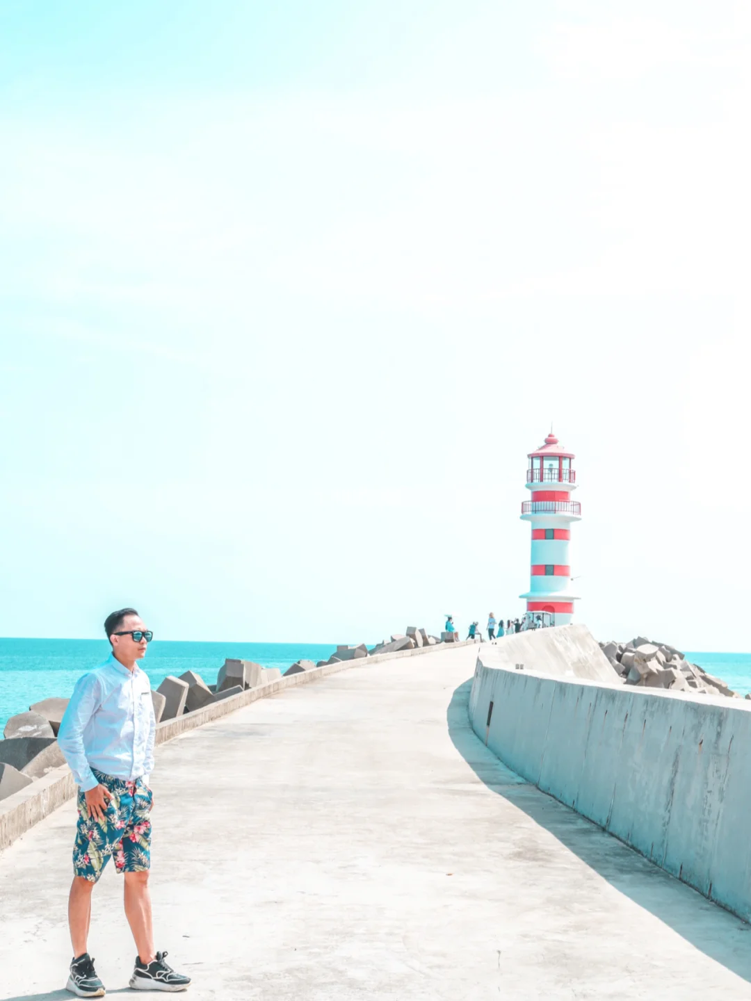 2、站在离灯塔最远的地方,背影拍摄灯塔,日式夏天的小清新。