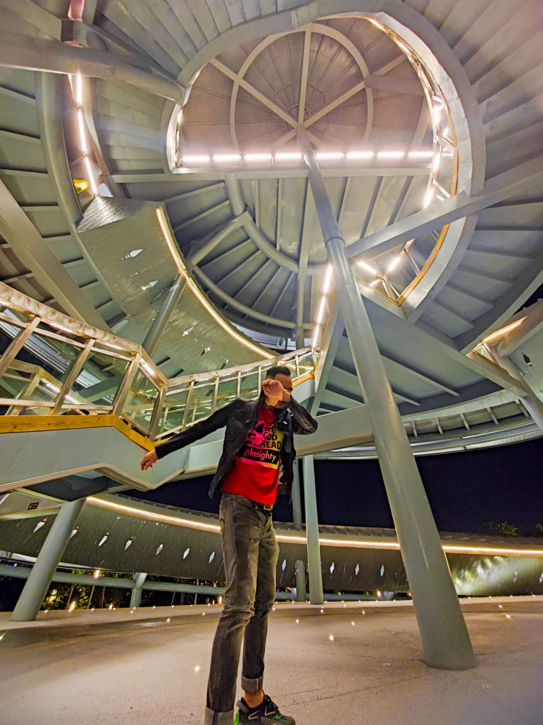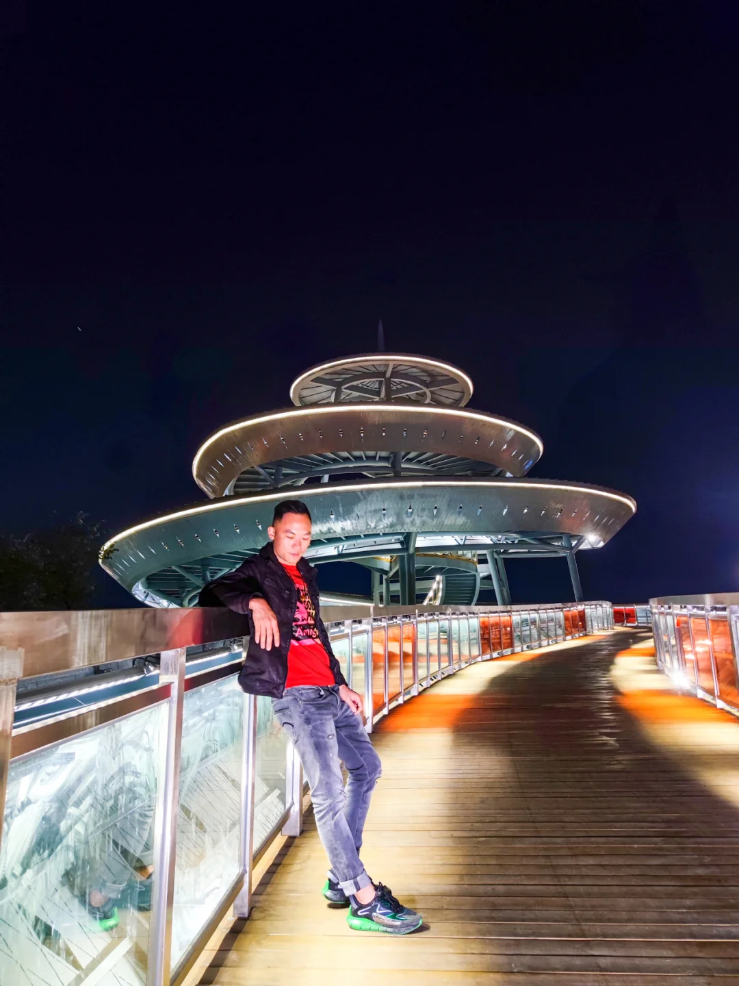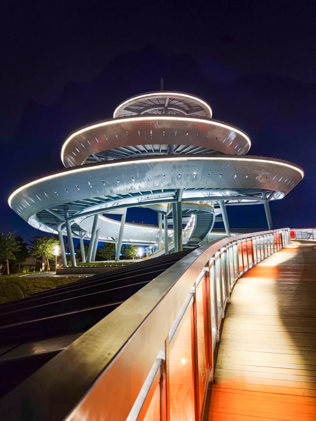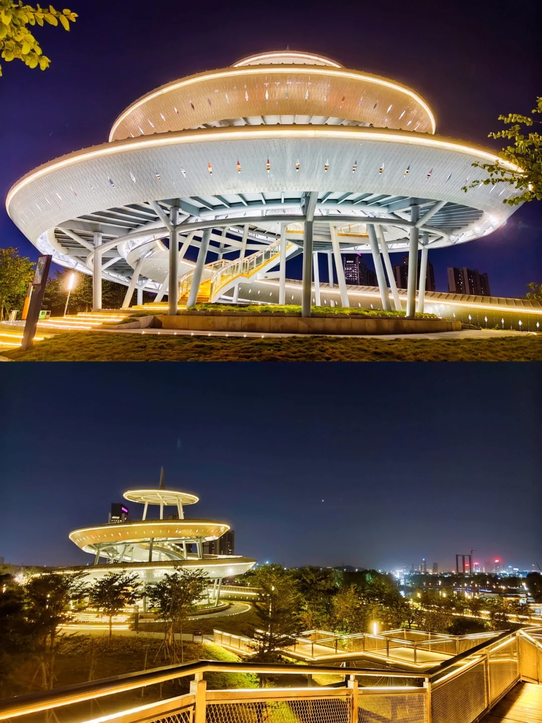 酷似UFO,傍晚拍照太出片了! 趁还没有大火 赶紧去打卡拍照吧。 地址:佛山南海区三山文瀚湖公园 距离广州约40分钟车程。 距离南海桂城约30分钟。 人像最佳拍照时间:大约傍晚5点半至6点半 太晚了光线不够。可以带个手灯补光。 【最佳拍照地】 1、栈道上去接近主体建筑的位置,没有树叶遮挡,五彩的玻璃,这时不管你是坐着还是站着都很出片。 2、站在建筑做上次,俯拍楼梯,很时尚的感觉。 3、站在建筑底,用广角仰拍,1米八大长腿的视觉。 4、建筑最下面的楼梯走出来,回头拍建筑,这里拍的建筑夜景最像UFO