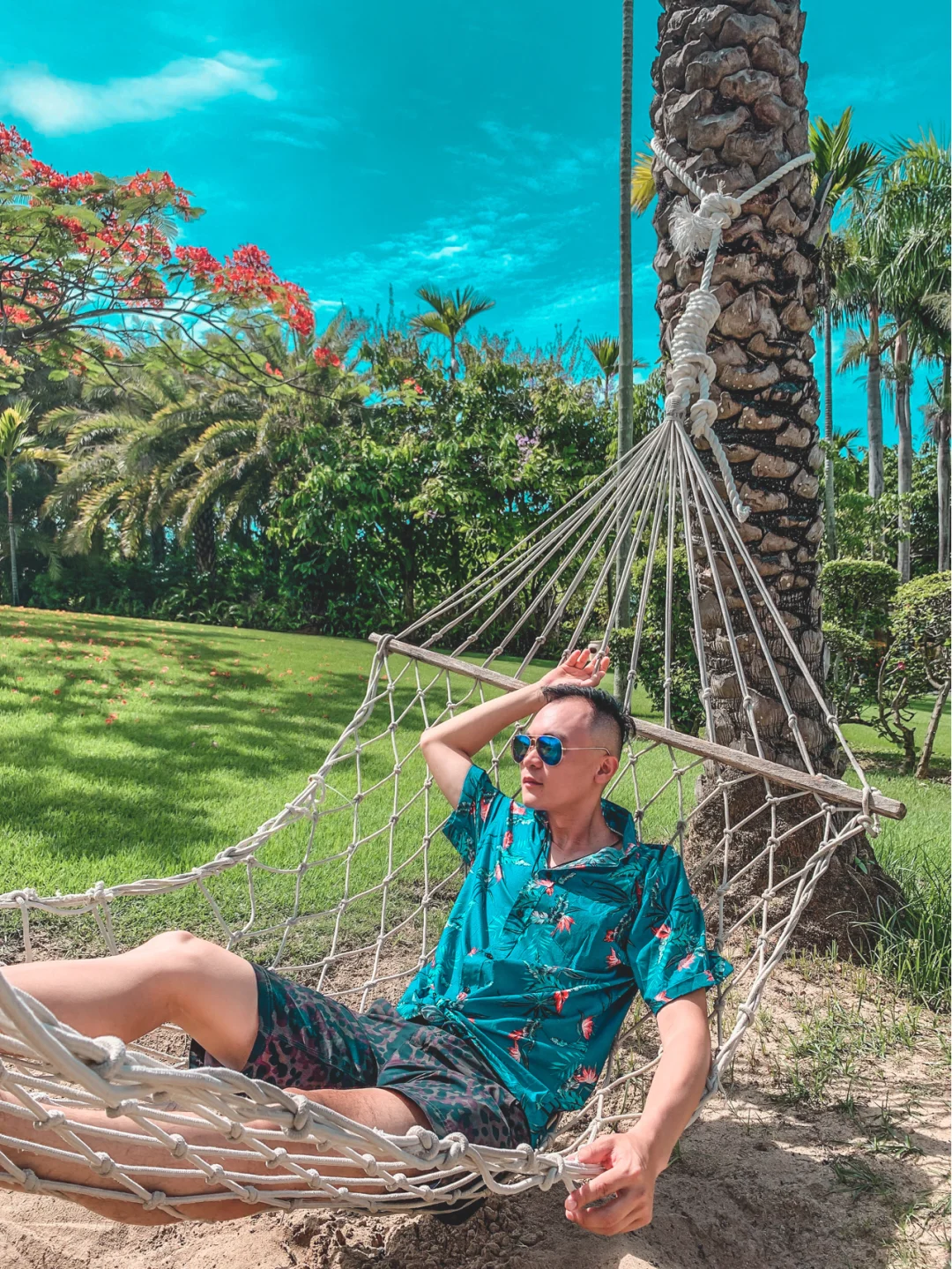 【拍照打卡点多】网红秋千、大草坪、旋转楼梯、酒店大堂、开花的凤凰树、酒店泳池、吊床。
