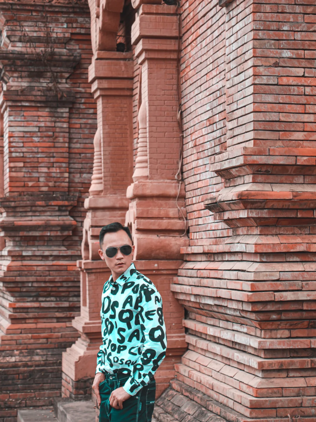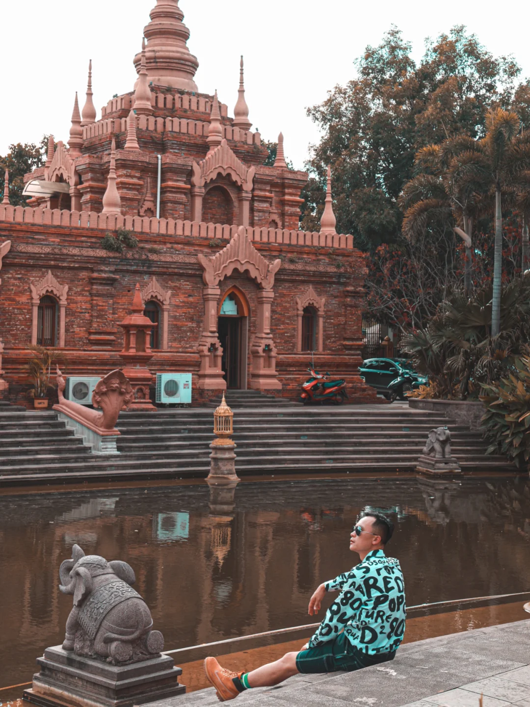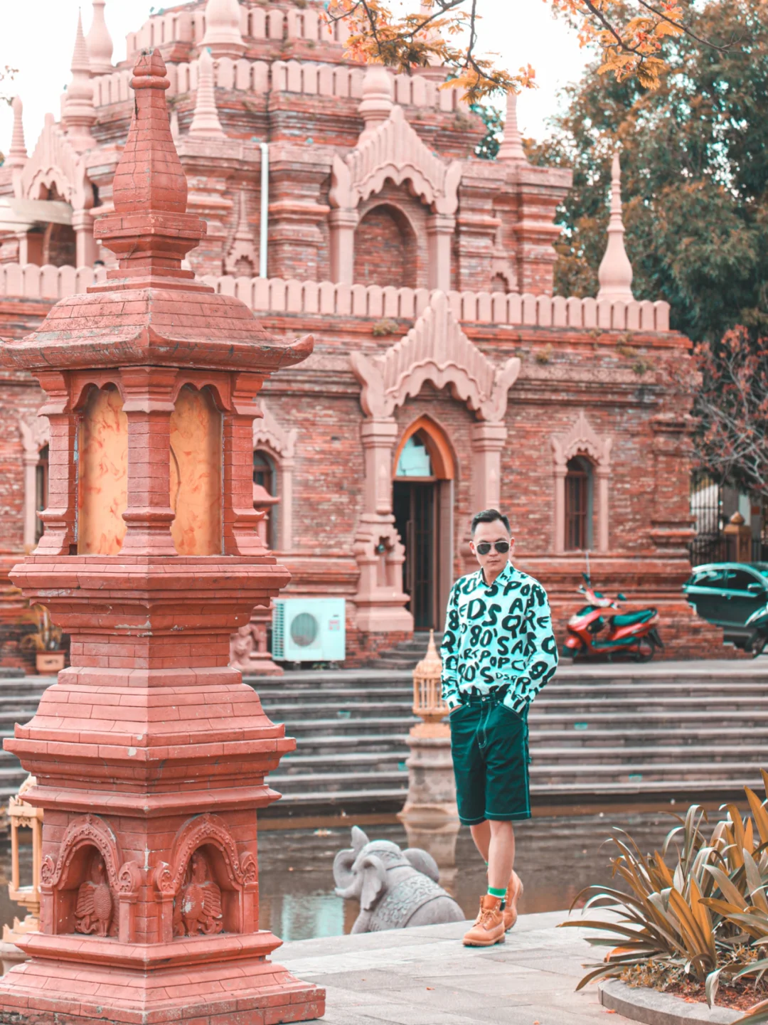 4⃣️走到河对岸,走近红色的傣族建筑,中近景拍照,让人物和建筑巧妙融合在一起。