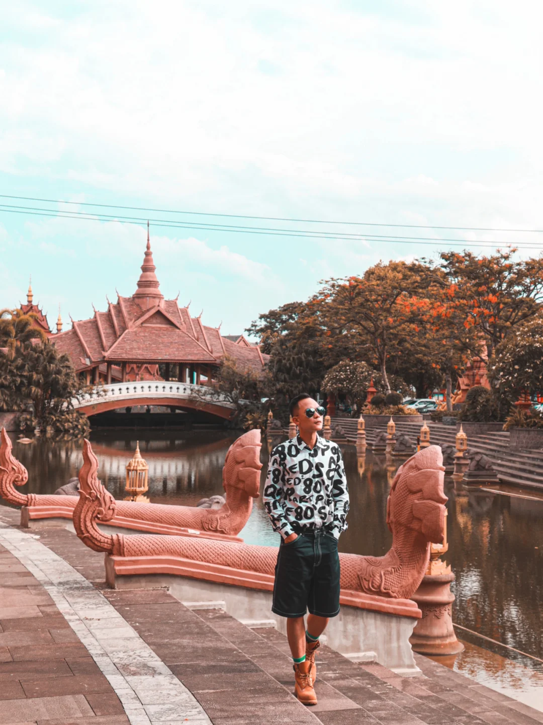 2⃣️走在河边,以远处傣族廊桥为背景,仿佛行走在泰国