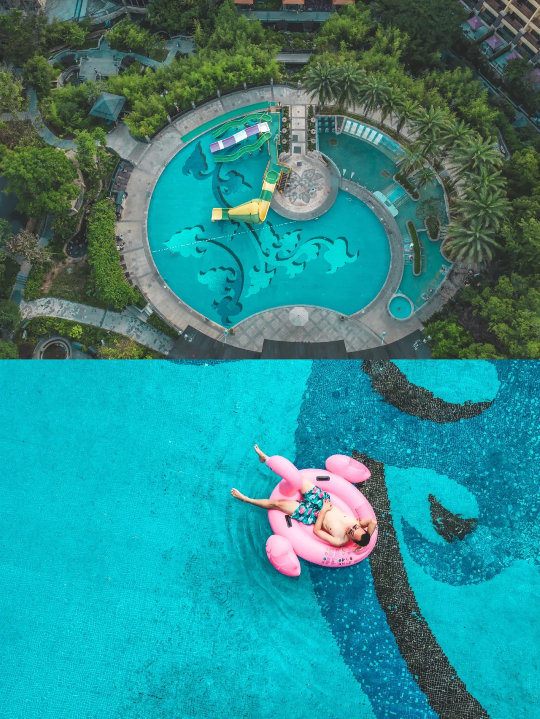 管家还很贴心的准备好了漂浮床和火烈鸟道具