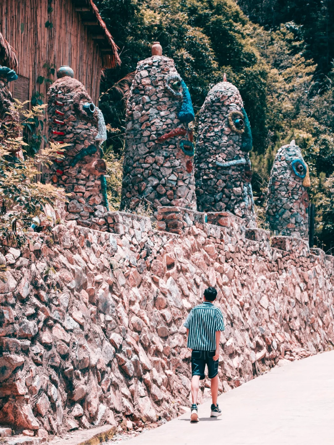 2⃣️从石头人那里走到路上,拍摄行走的背影。最好抬头看一下石头人,一定要迈开步子行走才会好看。