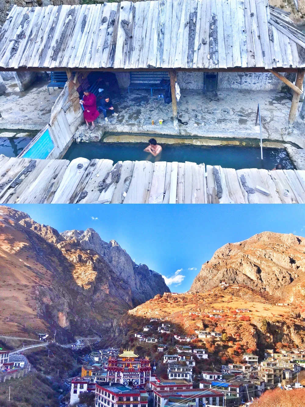 3、【直贡梯寺】【德仲温泉】。【直贡梯寺】离拉萨市区大约2个小时,19年底寺庙前近10公里在走路,有点颠簸。门票:45元。寺庙建在半山坡上,视野非常好,可以看到看宽阔的河谷和雪山。【德仲温泉】被称为世界第一热泉,已经有1400年的历史了。非常受藏族同胞的喜爱,从直贡梯寺出来大概20分钟就到德仲温泉了,这里分上温泉和下温泉,上温泉人特别多,这里的温泉是裸泡的,男女分开不同的泡池。如果害羞的朋友可以去下温泉那里人少,可以在房间里面换号衣服,裹上浴巾再下去(最好自己带浴巾过去)温泉是按人头收费的,一个人应该是20元。小编害羞没敢下水,只是用手洗了一下温泉水,非常润滑舒服。