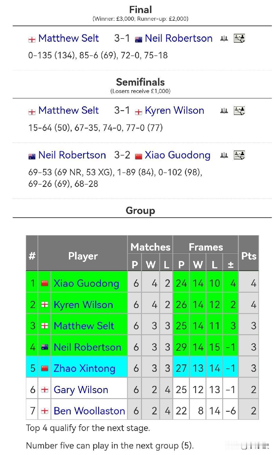 冠军联赛第四组结束,塞尔特3-1击败尼尔·罗伯逊夺冠。肖国栋半决赛2-3负于尼尔·罗伯逊,赵心童小组第五,获得了参加第五组的资格。 昨夜今晨循环赛后,小组排名如下,肖国栋第一,凯伦·威尔逊第二,马修·塞尔特第三,尼尔·罗伯逊第四,赵心童第五,加里·威尔逊第六,沃拉斯顿垫底。 前四名交叉半决赛,肖国栋2-3不敌尼尔·罗伯逊,塞尔特3-1胜凯伦·威尔逊。 决赛,塞尔特3-1战胜尼尔·罗伯逊夺冠。 排名37位的塞尔特能从众多高手中突围夺冠,实属不易,再次说明冠军联赛爆冷真是稀松平常。塞尔特还在小组循环赛中打出职业生涯第一杆147。 至此,邀请赛版本冠军联赛已经进行了四个小组的比赛,四个组的冠军分别是:福德、斯莱瑟、斯佳辉、塞尔特。 第五组的比赛将于1月19日-20日进行。