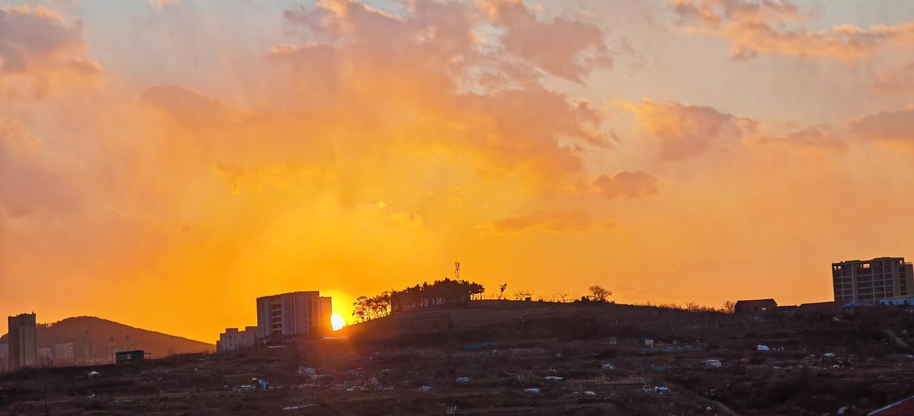 烟台的天空很美,但是一个字:冷 20256年1月10日7:20,太阳从东方小山坡上冉冉升起,由于刮着北风天气的云彩,别那么给力,漂亮而美丽。