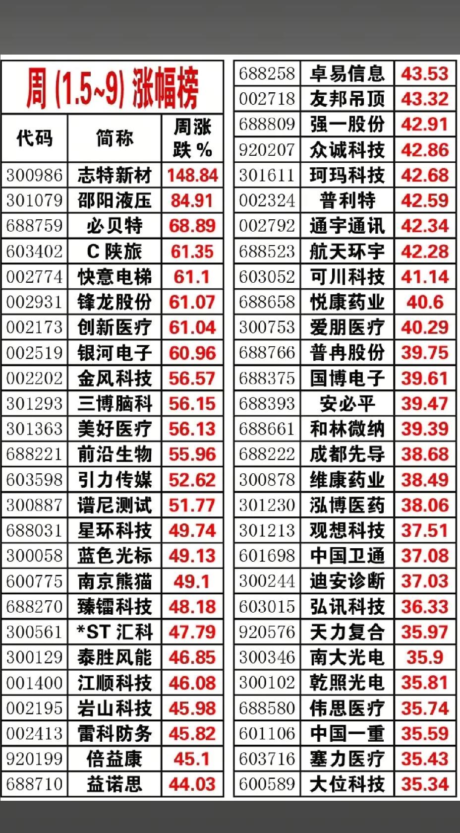 1月5号-9号,A股涨幅排行榜!!! 志特新材本周5连20cm涨停,本周涨幅148.84%;邵阳液压本周上涨84.91%,后市值得高看一眼;必贝特本周上涨68.89%,后市值得期待;快意电梯本周上涨61.1%,后市值得重点关注!!!