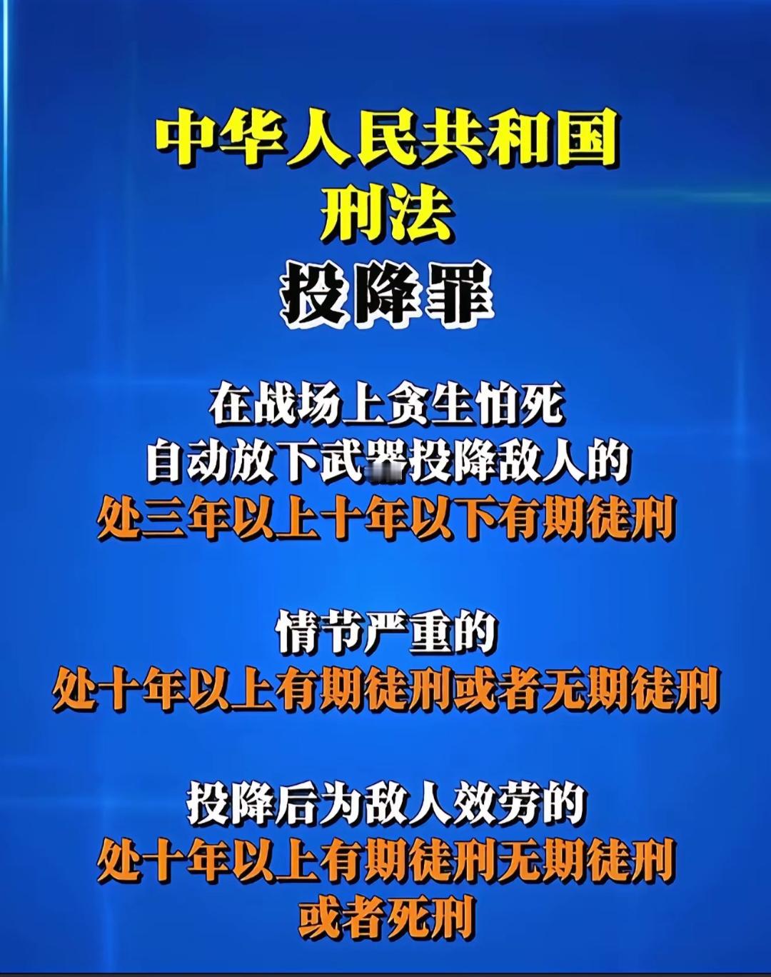 投降罪,触犯投降罪,轻的量刑三年以上,重的无期徒刑。很多人上战场后,看到敌军来势凶猛,看到敌人马上要打不过了,为了保命选择投降,要是在古代这可是要杀头的。很多英雄宁可为国捐躯赴国难,也不会投降,比黄继光的壮举是舍身堵枪眼、为胜利冲锋的英雄行为,他在战场上拼至最后一刻、宁死不降,这才正是军人职责与气节的极致体现,也刚好对照出投降罪的核心。战场上大家都是杀敌,若有抵抗能力却贪生怕死放下武器,会触犯投降罪。今天咱们一起聊投降罪,很多人容易搞混投降和被俘,今天一起聊聊。 首先得明确,投降罪可不是随便定的,它只针对参战的军人,不管是现役军人,还是正在执行军事任务的预备役人员,普通人根本不沾边,这是主体硬性要求。而且核心是主观上贪生怕死,战场上明明有抵抗能力,却因为怕受伤、怕牺牲,主动放下武器投靠敌人,这才叫投降罪,若是普通人投敌可能涉及的罪名:若为敌人效劳、危害国家安全,可能触犯投敌叛变罪(《刑法》第108条),该罪主体是一般主体,量刑轻的3年以上,严重的也是无期徒刑。 举个最直观的例子,士兵在战场上子弹充足、身体没受伤,眼看敌人马上要冲过来就慌了,为了保命直接把枪一扔举手投降,这妥妥就是投降罪。但反过来,要是跟敌人死战到最后,子弹打光了、武器炸坏了,或者自己重伤昏迷、失去反抗能力,最后被敌人俘虏,这绝对不算投降罪,也不会被追责,毕竟这是实在没办法了,不是贪生怕死。被放回来的话,最多也是隔离观察。但是观察期间发现异常的话,一样要收押。 再说说量刑,这可不是小事,刑法423条有明确规定,基础量刑就是3年以上10年以下有期徒刑,一旦沾上,这辈子基本就毁了。要是情节严重,量刑直接升级,10年以上有期徒刑甚至无期徒刑,啥叫情节严重?比如军官带头率部队投降,或者胁迫身边战友一起投降,又或者投降的时候还带着军事机密,这些都算情节严重,处罚更重。不但自己被处罚,自己家人也被监视,发现家人有异常,也要遭殃。 还有最严重的情况,投降之后还帮敌人干活,这就不是简单的投降罪了,属于加重情节,量刑直接到10年以上有期徒刑、无期徒刑,甚至死刑。比如投降后给敌人泄露我方部队部署、兵力情况,或者帮敌人训练士兵、出谋划策对付自己人,这些行为就是彻头彻尾的背叛,必然重罚。但要注意,要是投降后只是被迫给敌人干些体力活,比如挖工事、搬物资,没有主动帮着对付我方,那就不算为敌人效劳,不会加重处罚。 这里还要跟几个易混的罪名分清,别搞混了。首先是投敌叛变罪,这个主体是普通人也能犯,而且不用在战场,只要主动投靠敌人,还想危害国家安全就算,和投降罪的军人主体、战场场景完全不一样。然后是战时临阵脱逃罪,这个也是军人犯罪,但只是在战场上逃离战斗岗位,没投降敌人,和投降罪的核心区别就是有没有投靠敌人。 还有服役义务的人(征兵对象、预备役、现役军人)如果国家跟敌人战斗激烈,敌人来势凶猛,正规军人严重损伤,就会招这些人去抗敌,要是战时拒服兵役、甚至逃出境,可能触犯战时拒绝、逃避服役罪(《刑法》第376条第2款),情节严重的,处2年以下有期徒刑。 现役军人战场逃阵,构成战时临阵脱逃罪(《刑法》第424条),一般3-10年;致战斗重大损失的,10年以上、无期或死刑 。无论在哪个年代,都经常出现逃脱现象。这些都是要严惩的。 说白了,投降罪的核心就是军人在战场上、贪生怕死、为了保命主动放下武器投降这三个点,缺一不可。身为军人,保家卫国是天职,战场上哪怕战至最后一刻,也不能贪生怕死投降敌人,这既是职责所在,也是法律底线,一旦触碰,等待的必然是法律的严惩和一辈子的骂名,而在战场上宁死不降会名流千古,成为烈士。