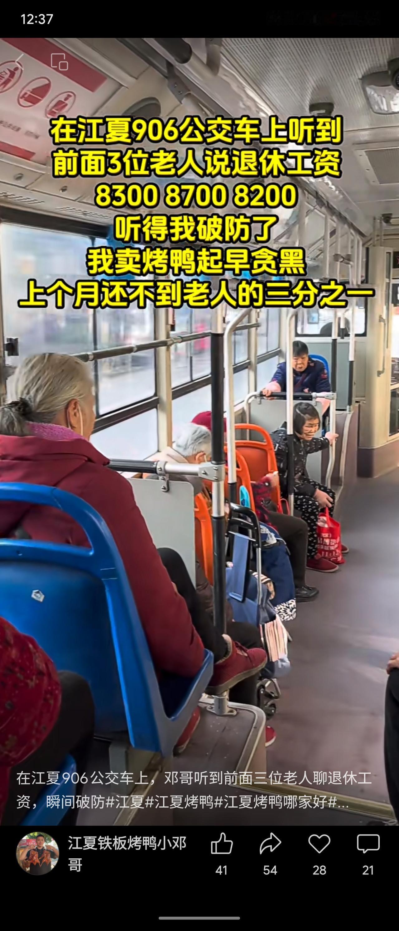 在公交车上,一位卖烤鸭的年轻人听到三位老人谈论退休工资(约8300-8700元),对比自己起早贪黑的月收入不足其三分之一,感到“破防”。这折射出部分劳动者与退休人员间的收入差距及代际经济压力。