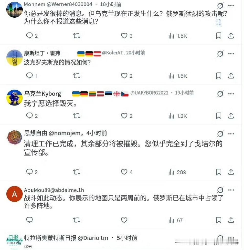 乌克兰联合部队突击兵团发言人维克托・特雷古博夫声明: 在库皮扬斯克肃清俄罗斯人行动已结束,剩余的最后一批俄罗斯人要么投降,要么被消灭。 [衰][衰][衰] 不得不感叹一下,乌克兰的指挥部都是些啥二皮脸在掌控啊…… 即使是国外乌友对此声明也完全不相信的模样(见图2和图3)…… 乌军突击兵团这类编制在第一波把俄军推出占领区之后,缺乏巩固占领区以及和俄军反复拉锯的预备队力量,只能做迟缓俄军进攻节奏的短促战术反击,根本扭转不了大局走向。 俄罗斯报复乌克兰