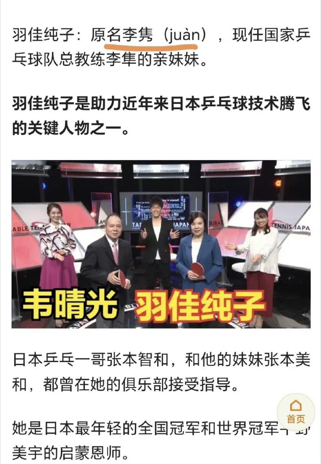 李隽,我国乒乓球国家队总教练李隼的亲妹妹,在日本做乒乓球教练,改日本名“羽佳纯子”,入了日籍,日本现役最强的乒乓球运动员都是她培养出来的。 去日本做教练,给日本培养乒乓球运动员,这倒没什么可说的。毕竟我们的乒乓球冠军拿得太多了,多到我们自己都觉得没意思了,搞出一个养狼计划,主动输出教练去提升别国的乒乓球水平。 问题在于,她入了日籍,改了日本名字,这是何意味? 她亲哥是中国乒乓球队总教练,会不会泄露内部信息给她?虽说区区乒乓球的内部信息,还够不上国家机密。但这样一来,她培养出来的运动员水平高,有没有可能是沾了这些内部信息的光呢?