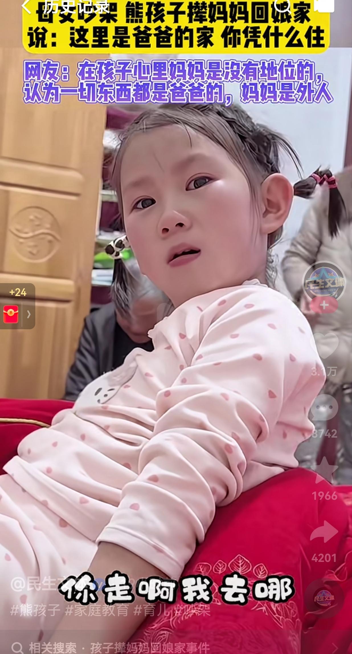 这孩子就是欠教育!一个小女孩跟妈妈吵架了,熊孩子竟然要撵妈妈回娘家,只见孩子凶巴