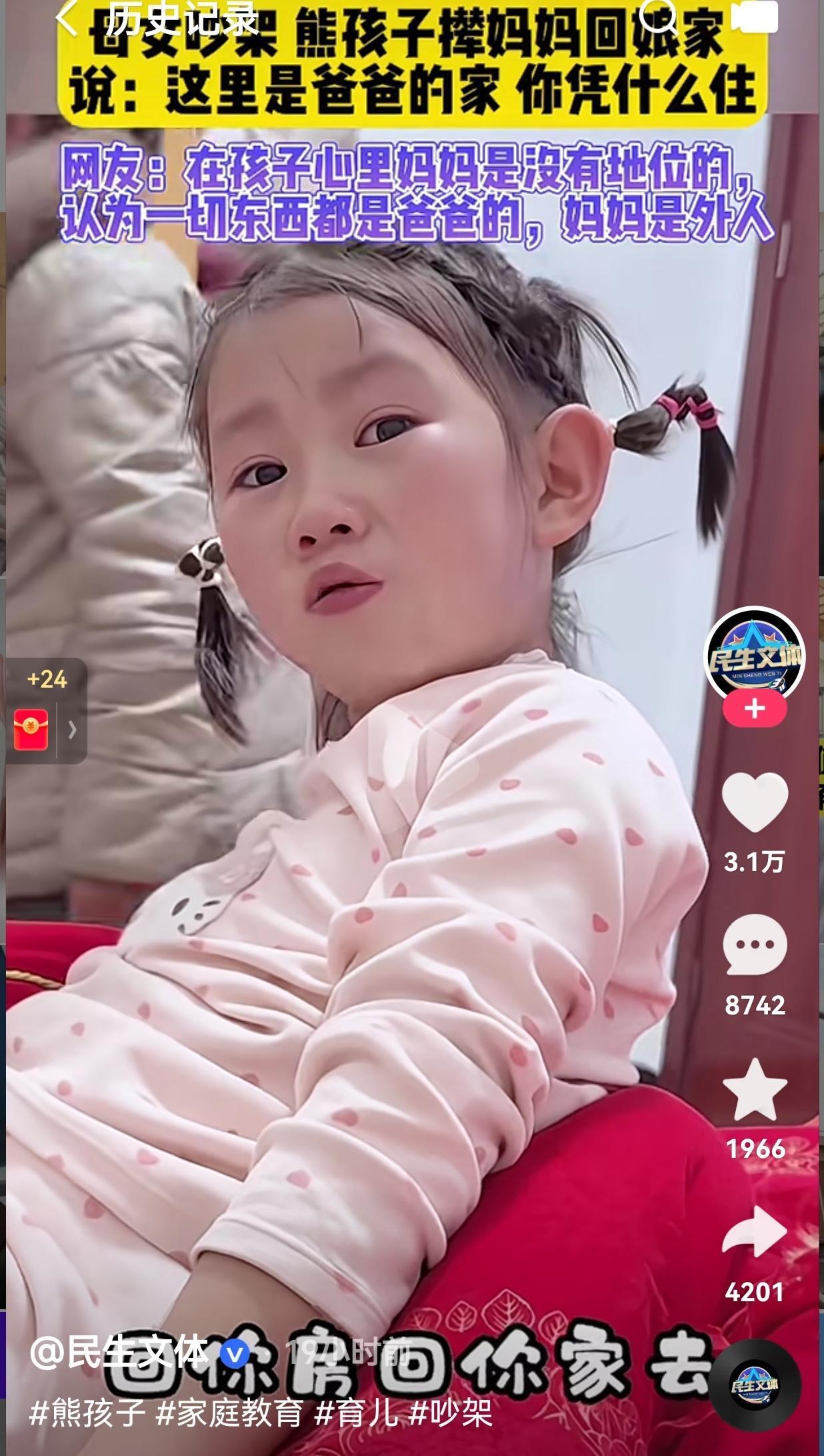 这孩子就是欠教育!一个小女孩跟妈妈吵架了,熊孩子竟然要撵妈妈回娘家,只见孩子凶巴巴地说:“这是我爸爸的家,你凭什么住?回你家去!” 妈妈问:“你要赶我是不是?那你说我家住哪?” 孩子脱口而出:“你家住河桥。” 妈妈又问:“你不让我住王楼,是不是?”。 孩子竟然这样说,孩子说:“房子是爸爸买的 另外一个房子也是我爸爸买的。”那我爸爸买的房子,凭什么让你住?而且,凭什么你不让他跟你睡一个房间? 妈妈说:“我是你爸的媳妇,你是老几?” 孩子说:“我爸是老大,你是这个家里的老三。 妈妈说:“我是老三?你开玩笑吧?我才是这个家里的老大。” 更让人心寒的是,视频里孩子跟妈妈对话的瞬间,家里的长辈也在现场,可是,面对这种情况,却没有人及时纠正孩子的错误。 此事传到了网上,引发无数网友的热议,有的网友说:“有矛盾很正常,跟妈妈吵嘴也正常,但是身为妈妈的孩子,你怎么能撵妈妈离开呢?” 还有的网友说:“别总跟孩子强调父母两个人谁赚钱多,要让他知道,爸爸妈妈为家做的事,没有轻重之分。” 这事儿也给所有家长敲了个警钟:家庭里从没有“谁的家”,只有“我们的家”。爸爸的钱是养家的底气,妈妈对这个家庭的付出,也不容忽视。 作为家长,千万不要让孩子觉得,谁赚得钱多,谁在家里的地位就高。更别让妈妈的付出,变成孩子眼里“理所当然的外人”。 希望这个小女孩能早点明白,妈妈不是家里的租客,是和爸爸一起撑起这个家的人。也希望每个家庭都能记住,爱与尊重,才是给孩子最好的家教。 针对此事,你有什么看法呢?