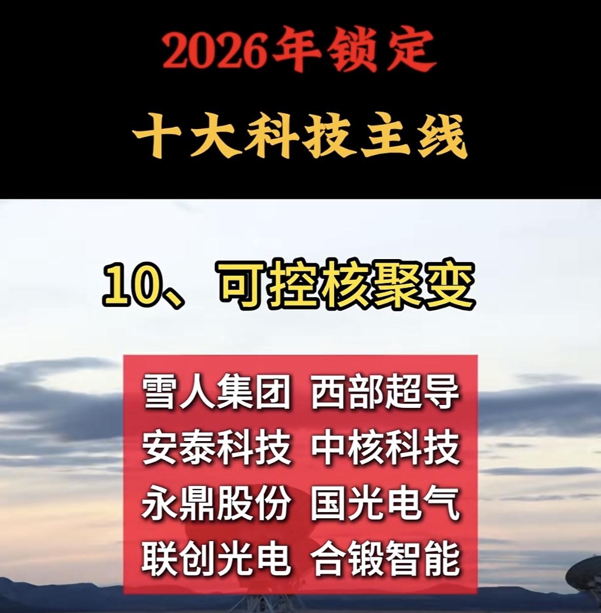 2026年锁定十大科技主线,可控核聚变领跑未来! 2026年科技聚焦商业航天,关注卫星与电子领域核心企业,把握航天动力与创新机遇。 关注卫星与电子领域核心企业,把握航天动力与创新技术发展机遇。