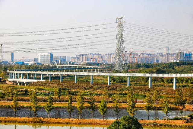 武汉光谷空轨旅游线,光谷中央生态大走廊空轨旅游线轨道全景远眺。视觉中国图