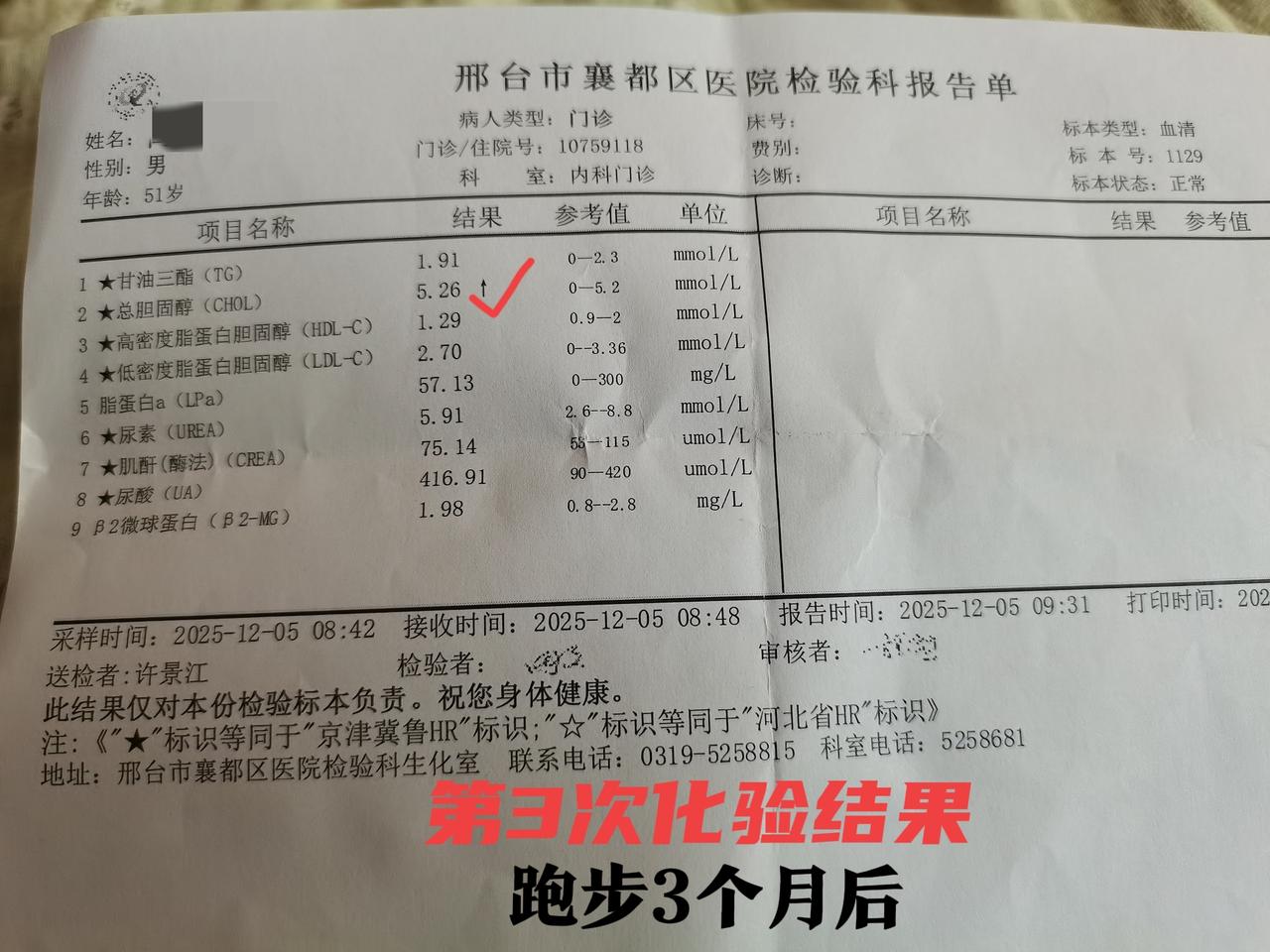 第4次化验结果出来了:坚持慢跑对身体的影响挺大的,结果太满意了! 入秋后恢复跑,坚持慢跑,跑一休一,每次5—6公里,不刻意节食,晚上偶尔吃一小把南瓜籽,只喝水不吃东西。 身体的指标,全部恢复到正常范围,同时也证明:通过慢跑改善体质,的确非常有效。 (下图4次化验均是本人,同等情况下的化验结果,可比性很强,有兴趣的朋友,可以仔细做个对比。)