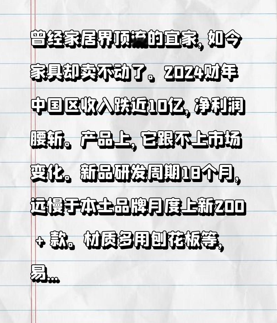 曾经家居界顶流的宜家,如今家具却卖不动了。2024财年中国区收入跌近10亿,净利润腰斩。 产品上,它跟不上市场变化。新品研发周期18个月,远慢于本土品牌月度上新200 + 款。材质多用刨花板等,易变形,而本土同价位有全实木。早期产品适配欧美需求,对中式厨房等痛点响应慢。 渠道和体验也差强人意。大店在远郊,Z世代不愿跑;线上布局滞后,错过电商黄金期。物流安装也不省心,大件运费高还多自提自装。现在去宜家的人,多是奔着9.9元套餐,餐厅热闹,家具区冷清,宜家真该好好想想出路了。